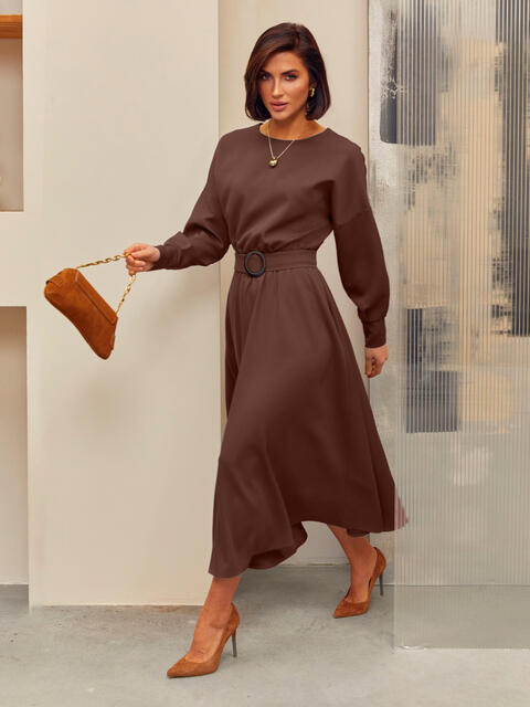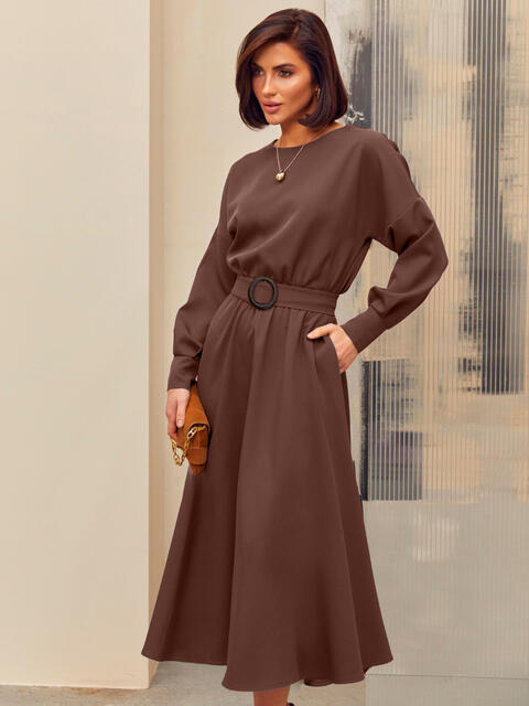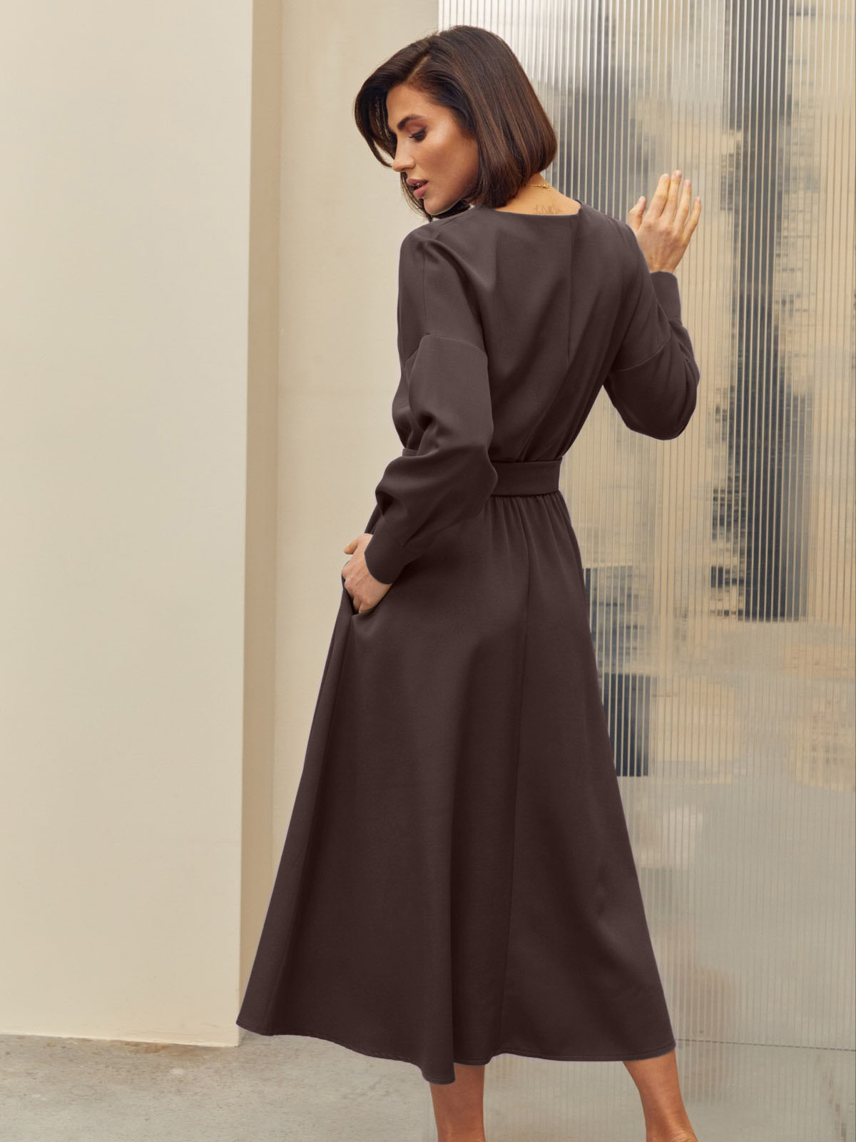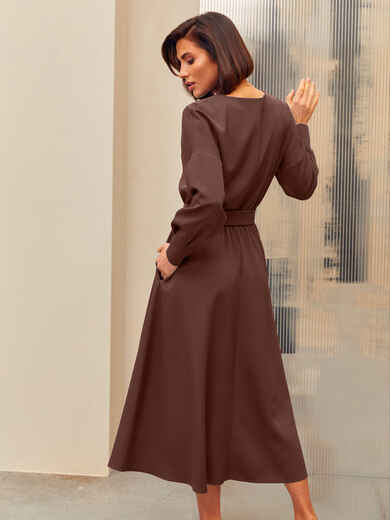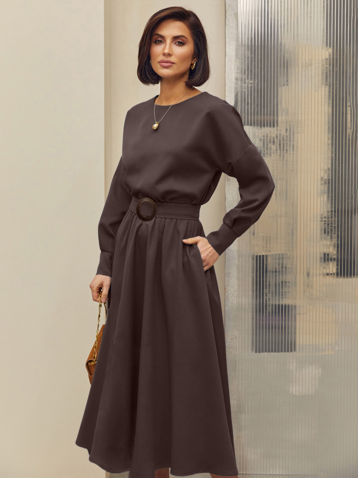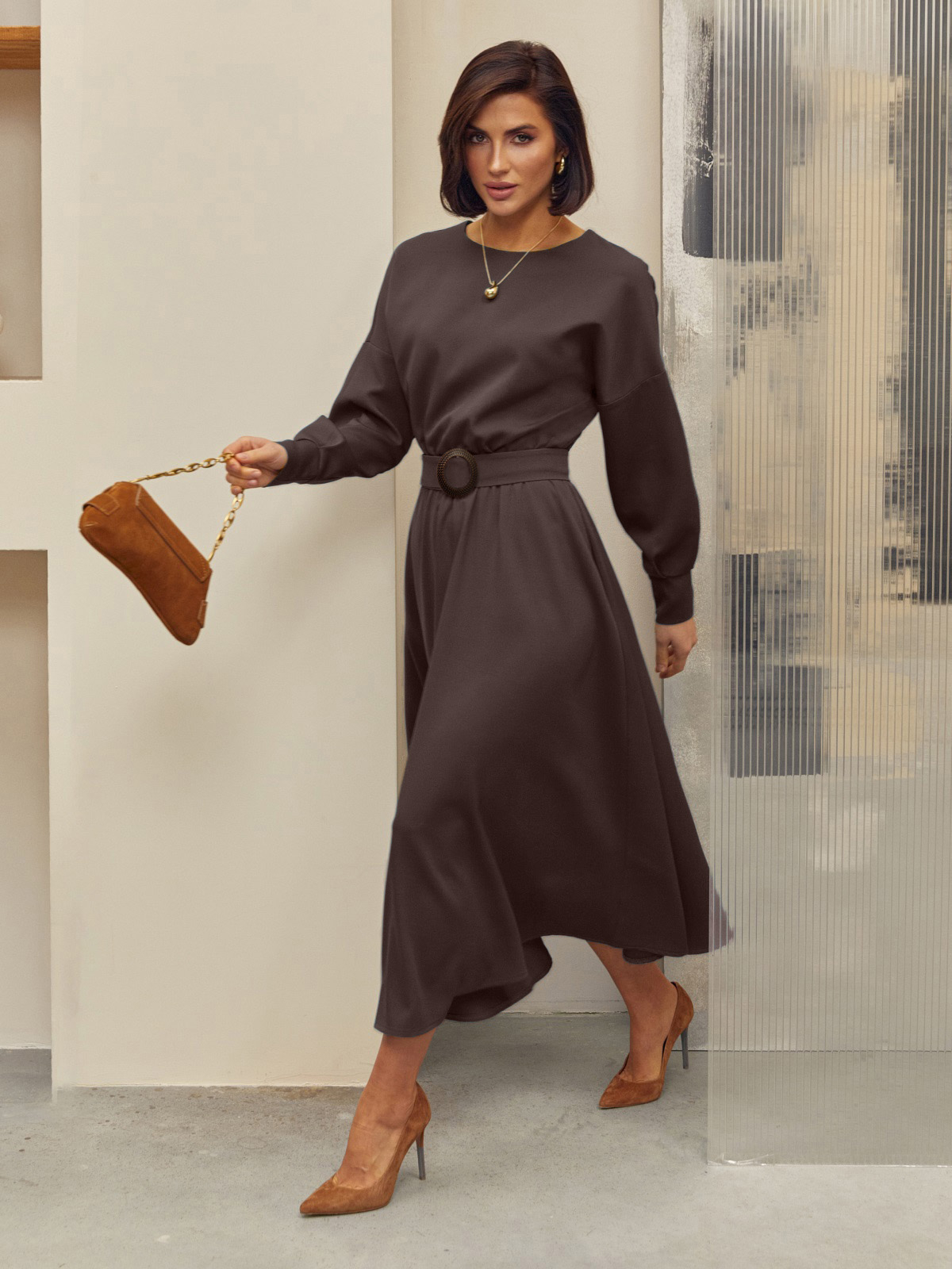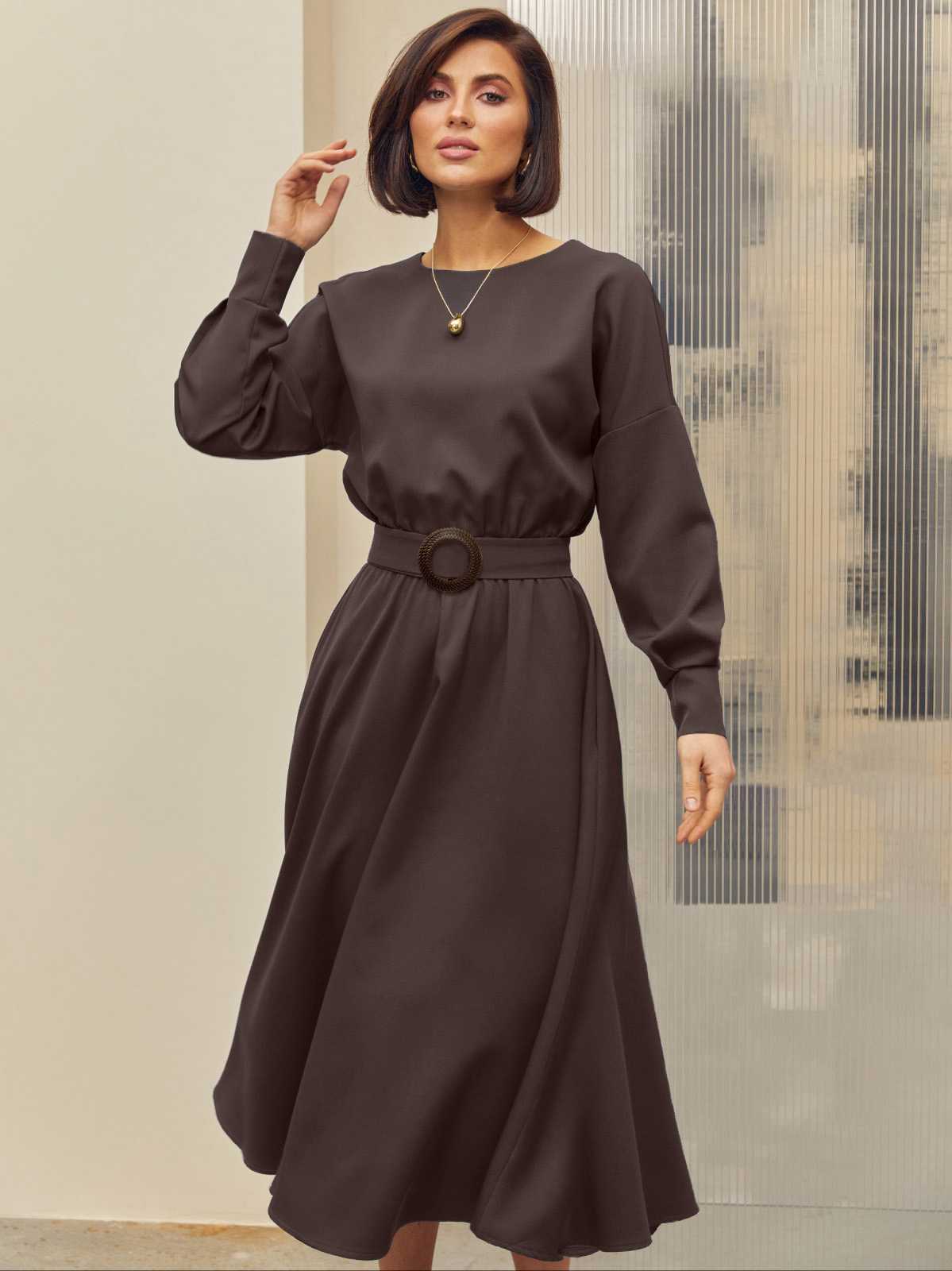 Стильна сукня-міді зі спущеною лінією плечового шва. Модель с розкльошеною спідницею і резинкою в поясі. В комплекті пояс з основної тканини.