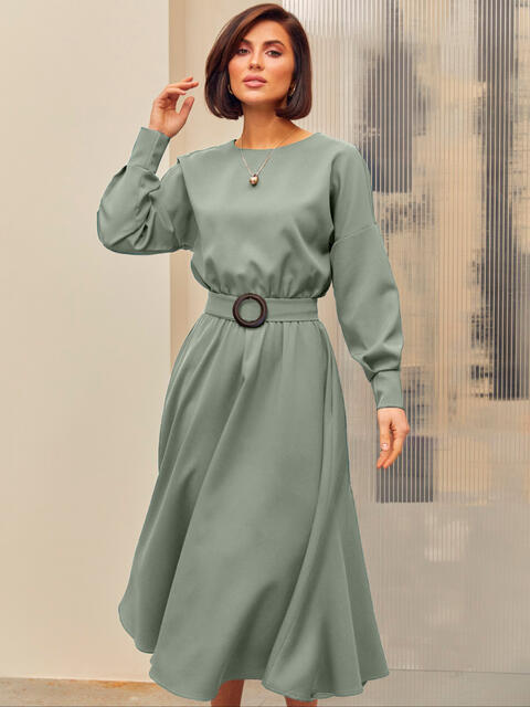 Стильна сукня-міді зі спущеною лінією плечового шва. Модель с розкльошеною спідницею і резинкою в поясі. В комплекті пояс з основної тканини.