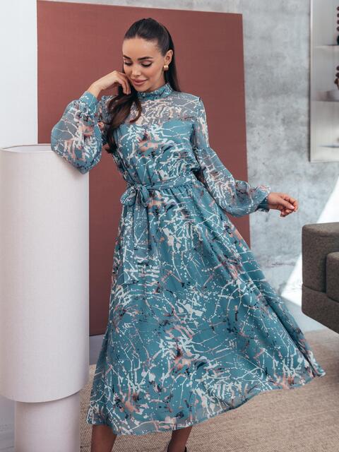 Стильна сукня-міді зі спущеною лінією плечового шва. Модель с розкльошеною спідницею і резинкою в поясі. В комплекті пояс з основної тканини.