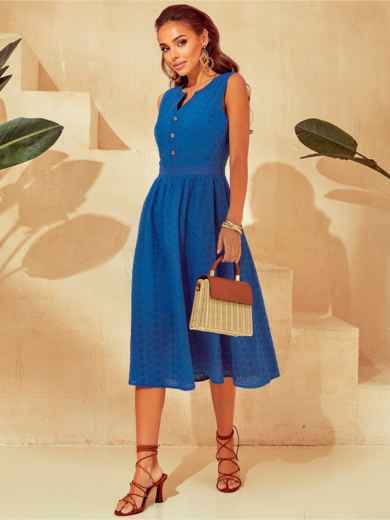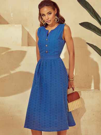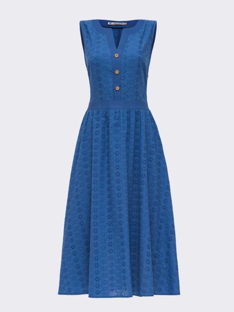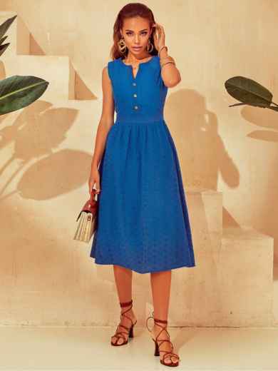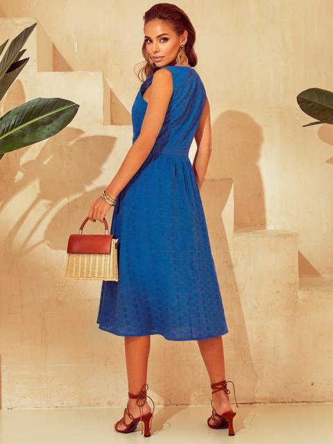 Плаття з прошви з розкльошеною спідницею і фігурним вирізом. Модель відрізна вздовж талії, доповнена декоративними ґудзиками спереду. Передбачена бавовняна підкладка. Застібається на потаємну блискавку збоку.
