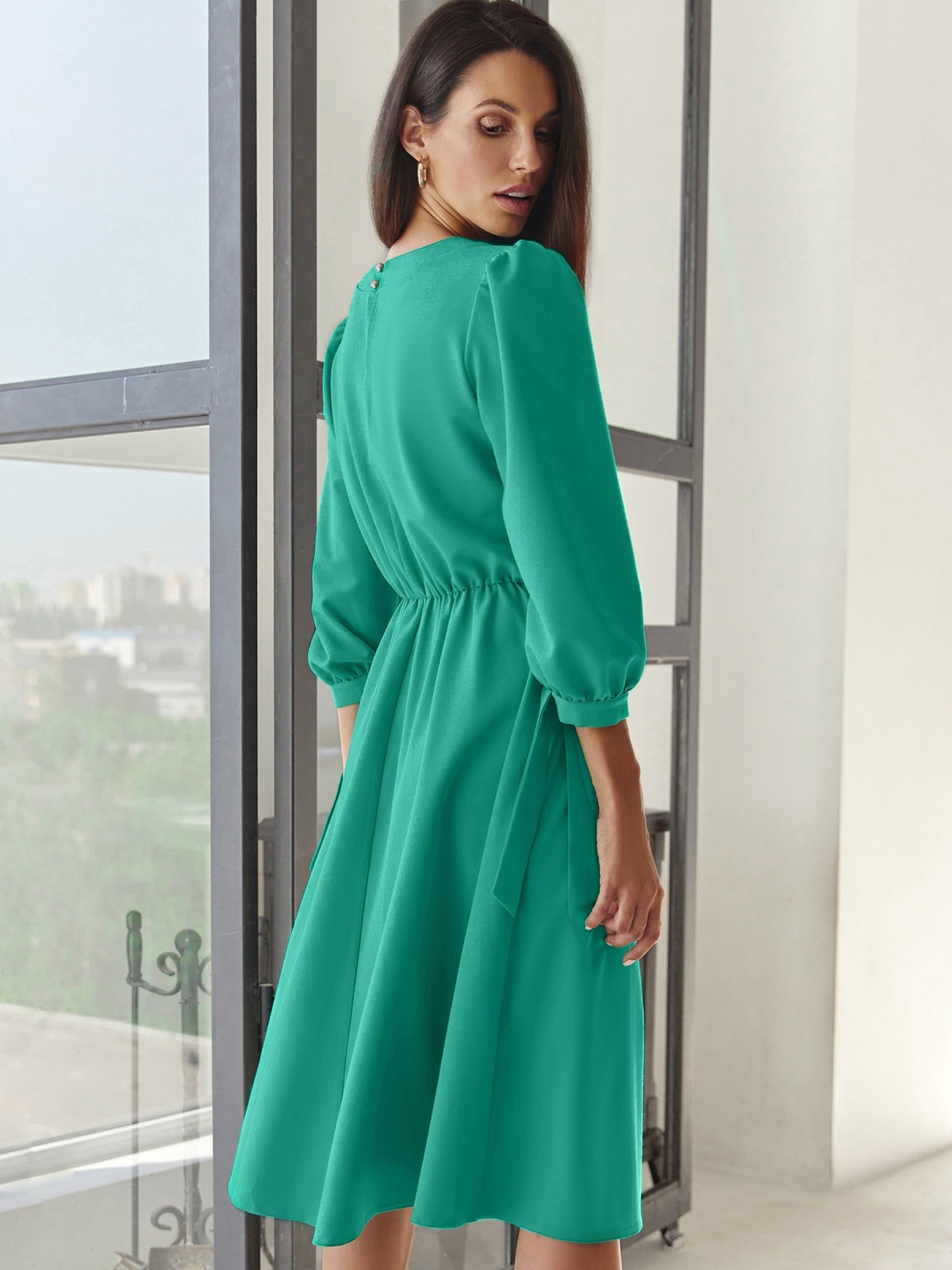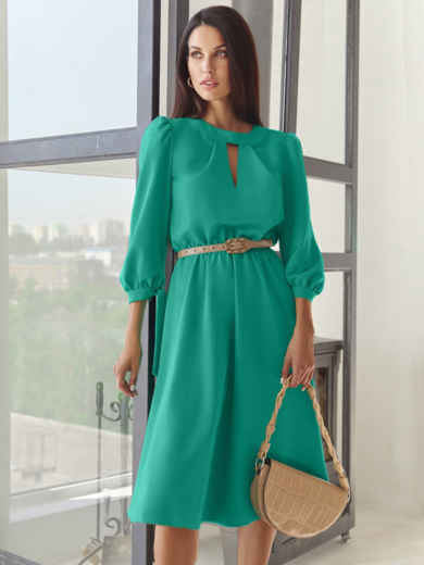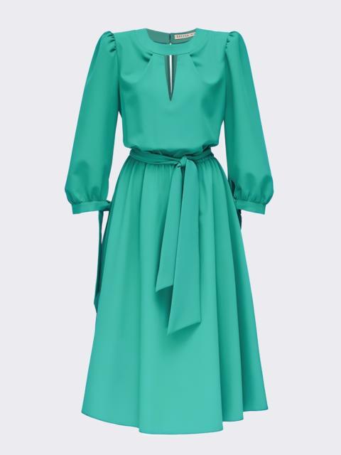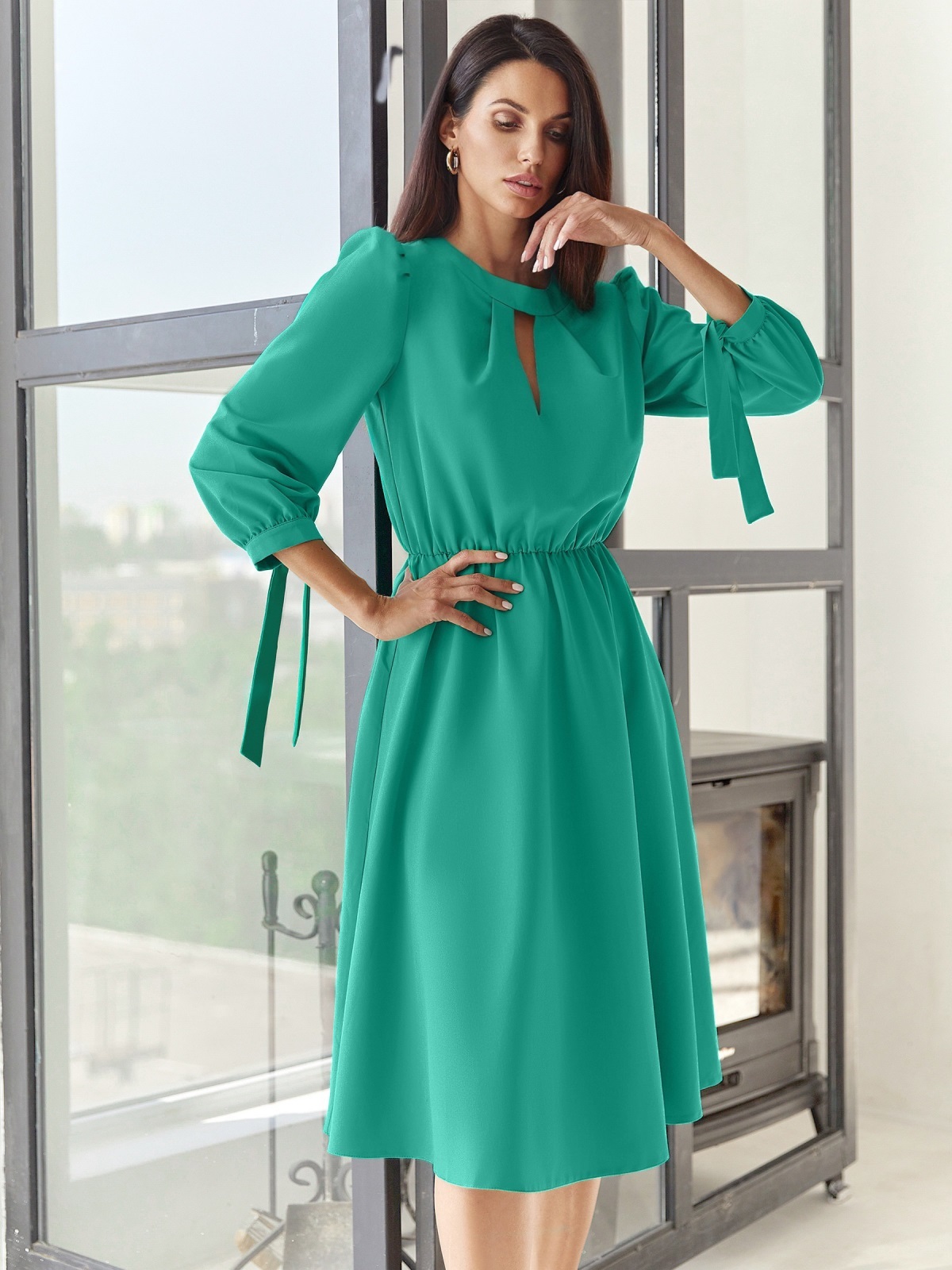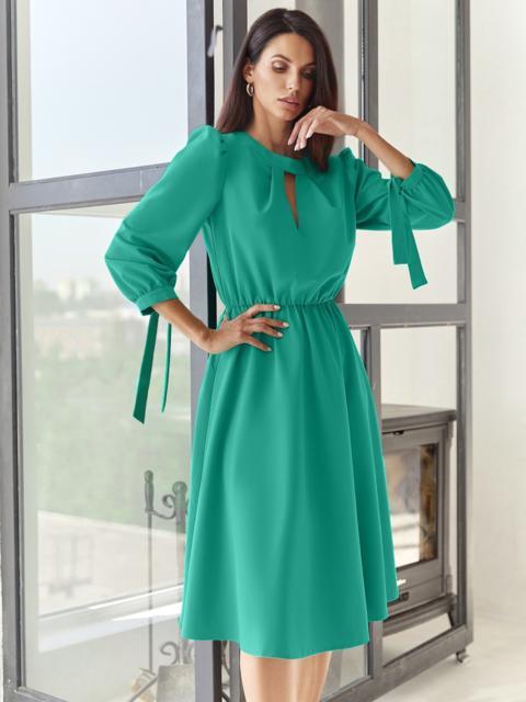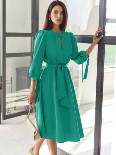 Плаття з фігурним вирізом горловини та резинкою в поясі. Модель з розкльошеною спідницею, доповнена зав'язками на рукаві. Пояс в комплекті.