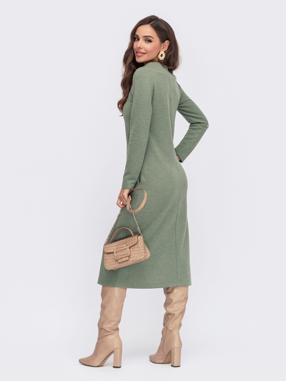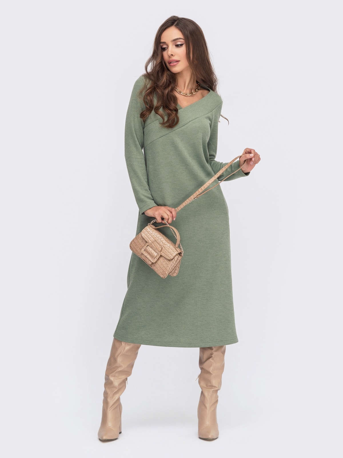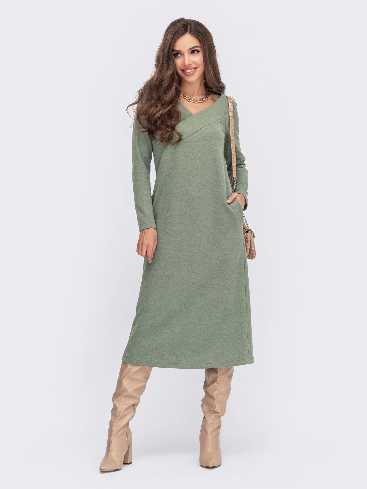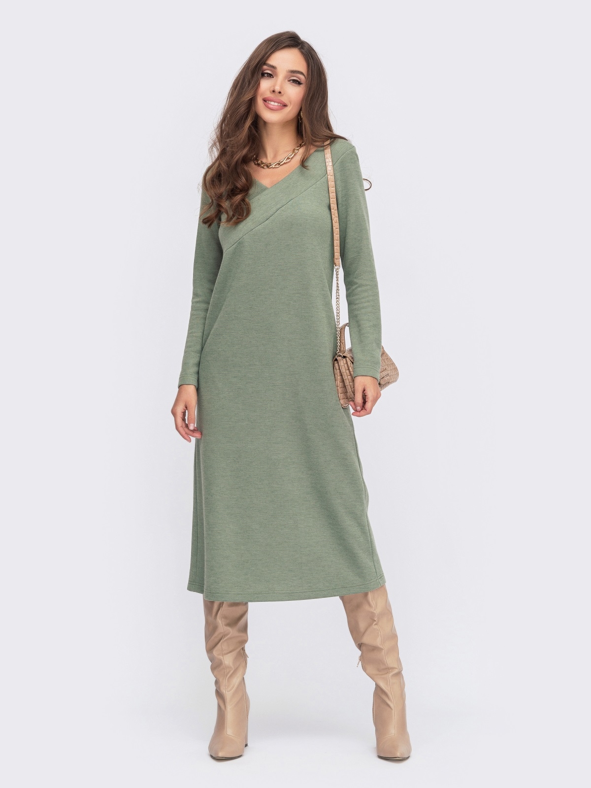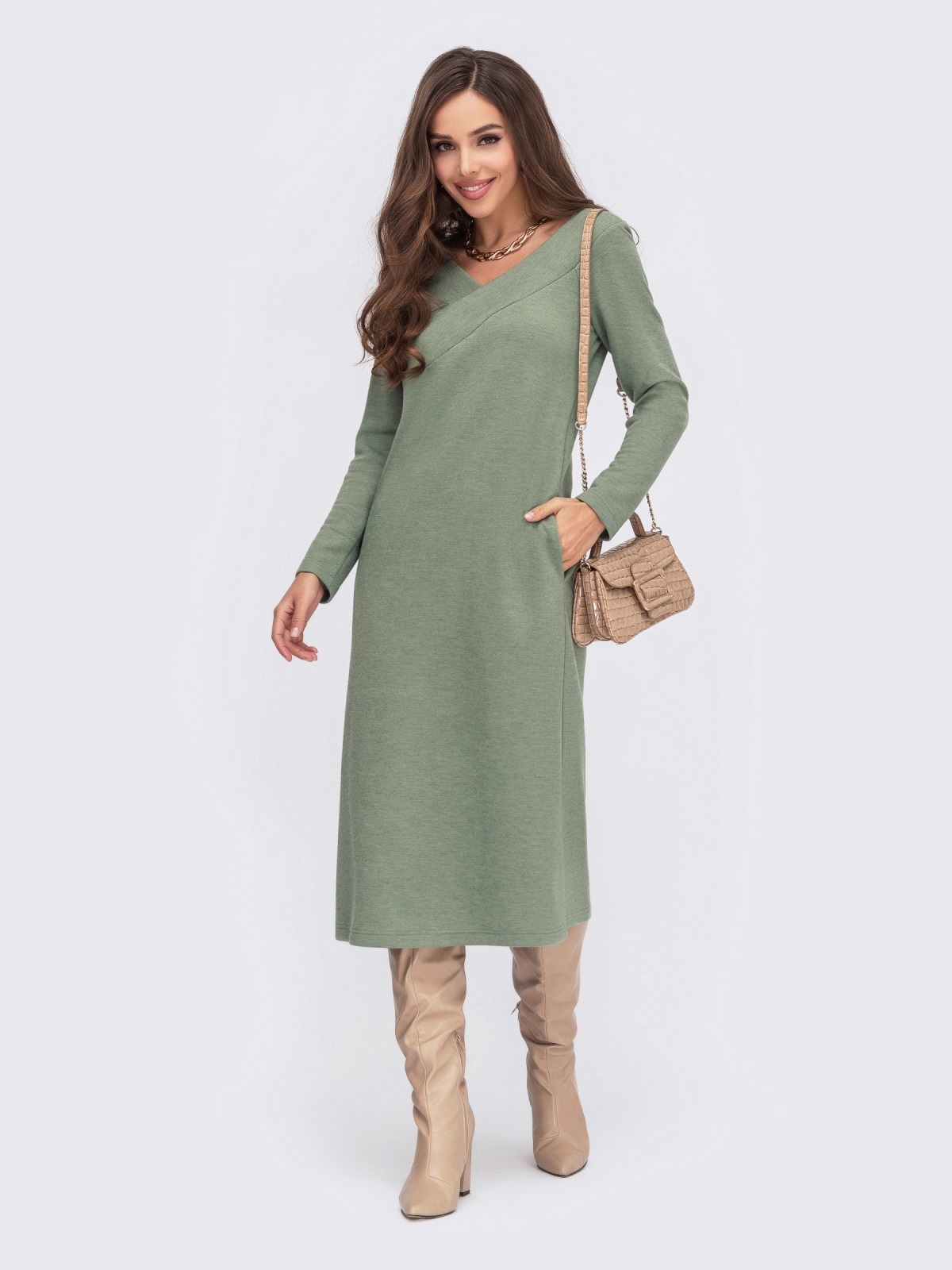 Тепле плаття А-силуету з ангори з V-подібним вирізом. Модель з довгим рукавом-реглан та кишенями в бічних швах.