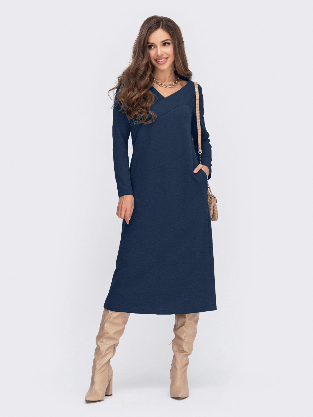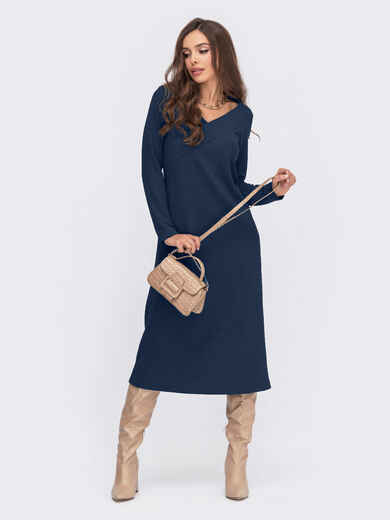 Тепла сукня А-силуету з ангори з V-подібним вирізом. Модель з довгим рукавом-реглан та кишенями в бічних швах.
