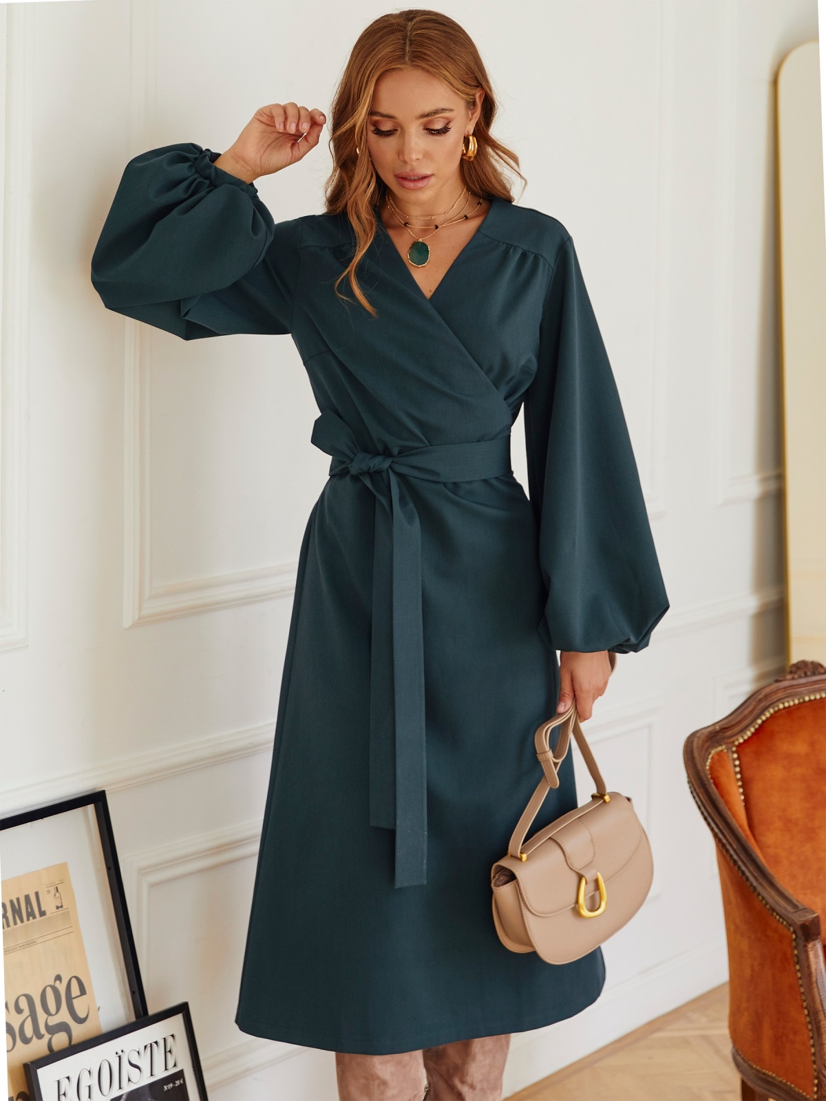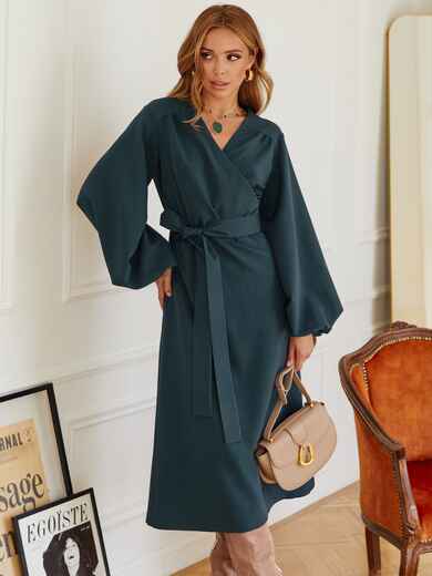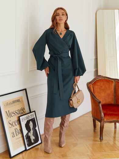 Сукня-кльош з ліфом на запах. Довгі рукави фасону "дзвін" та манжетами на гумці. Комплектується поясом із основного матеріалу.