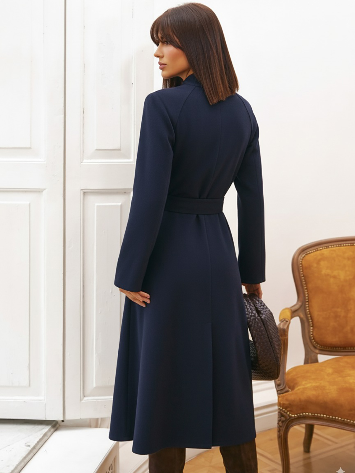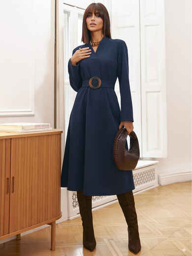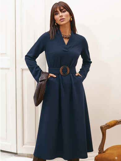 Повсякденна сукня-міді. Виріб з V-подібним вирізом горловини та рукавами реглан. Відрізна по талії. Модель без застібки. Комплектується текстильним поясом із пряжкою.