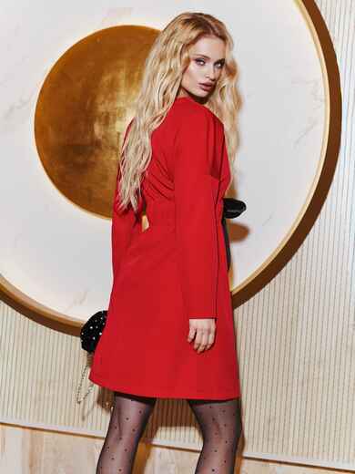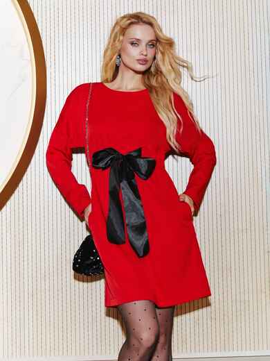 Сукня з костюмної тканини. Виріб зі спущеною лінією плечового шва та еластичною деталлю в поясі. Спереду куліса з атласною стрічкою, яка додає урочистості.