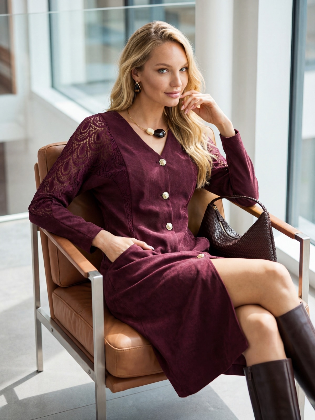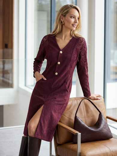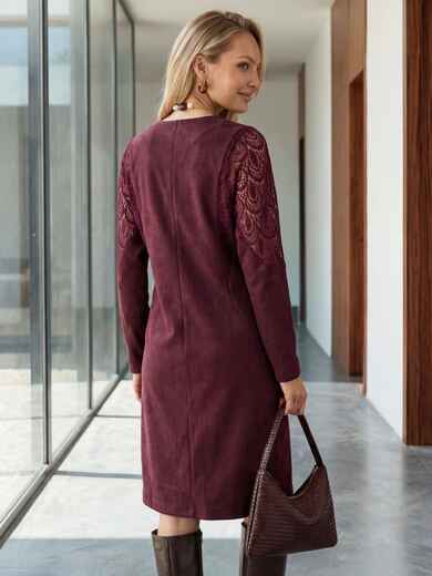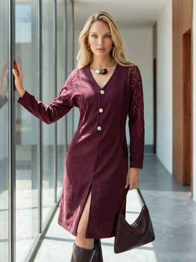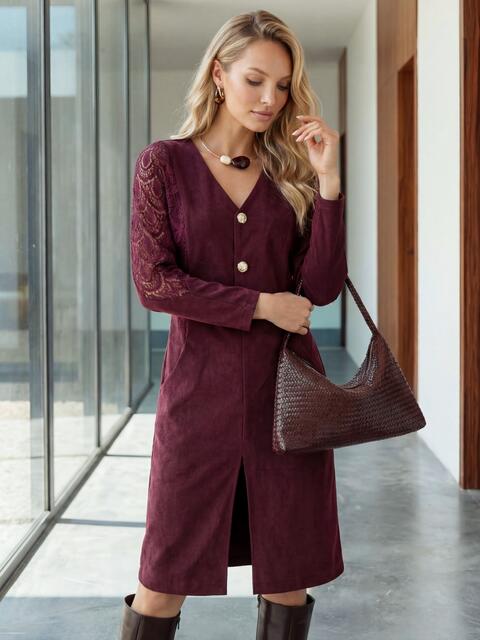 Сукня з V-подібним вирізом та гіпюровими вставками. У зонах прилягання білизни, під мереживом, є підкладка. Сукня доповнена кишенями з боків.