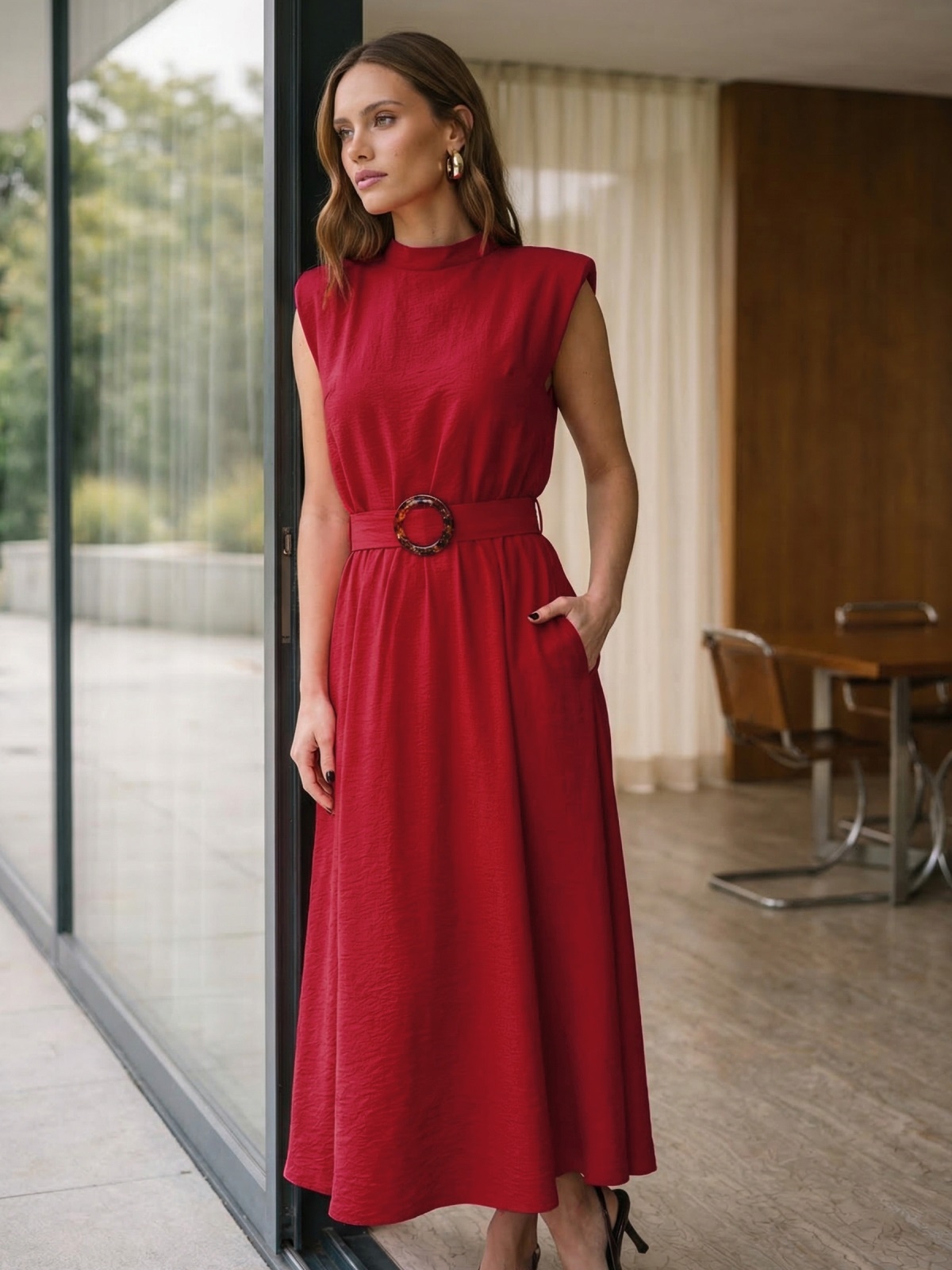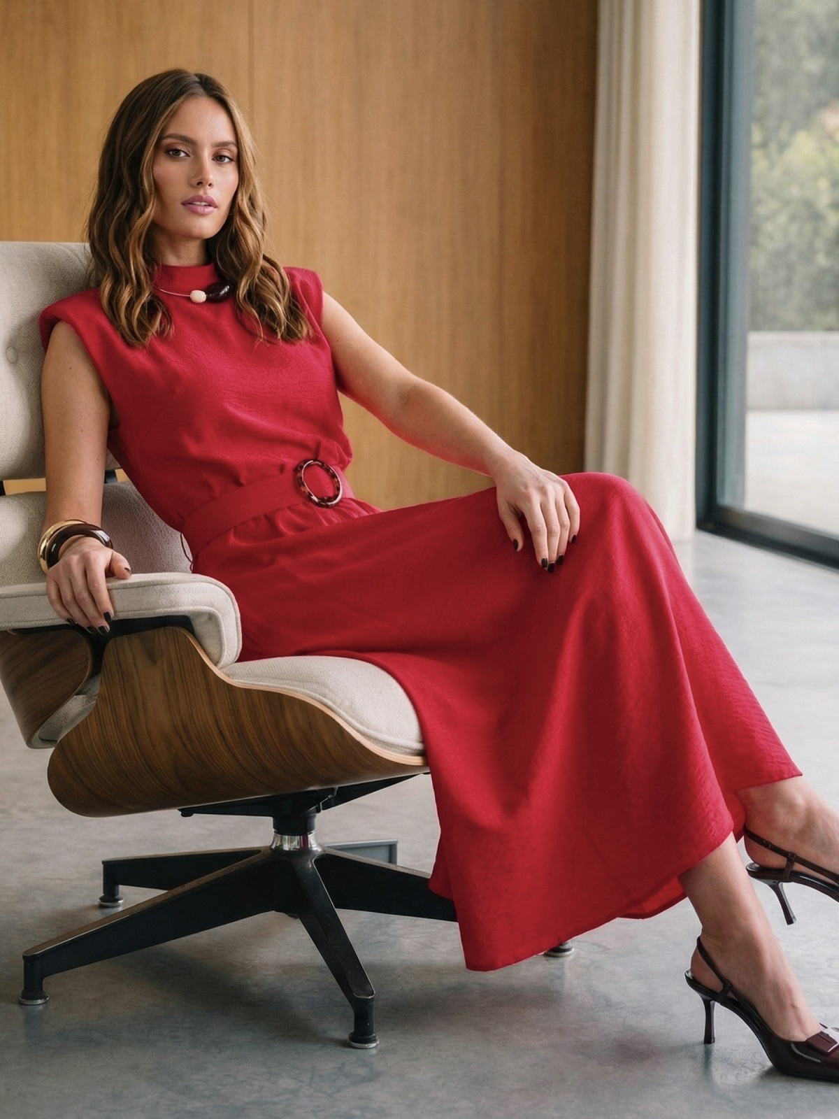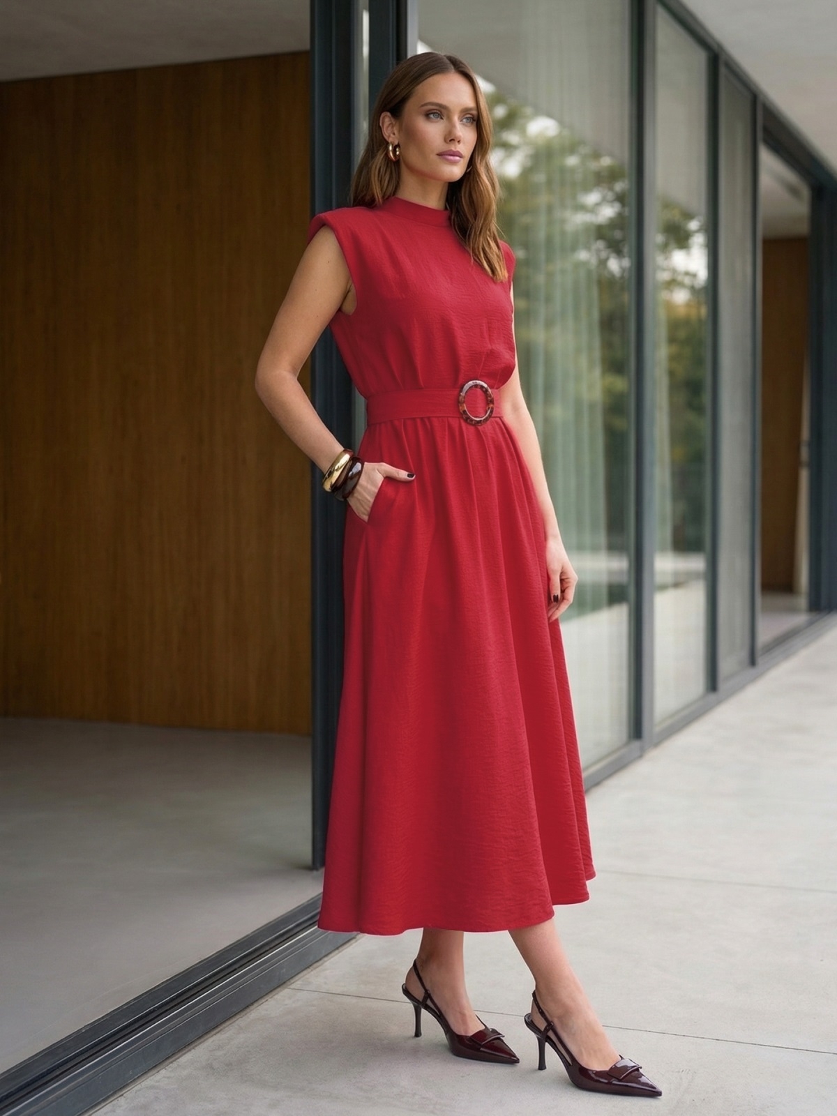 Елегантна сукня мiдi з жатого льону з підплічниками та поясом створює сучасний і жіночний силует. Червоний відтінок робить образ більш виразним.