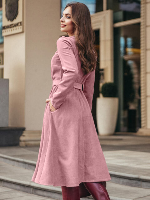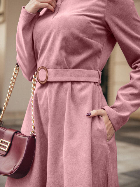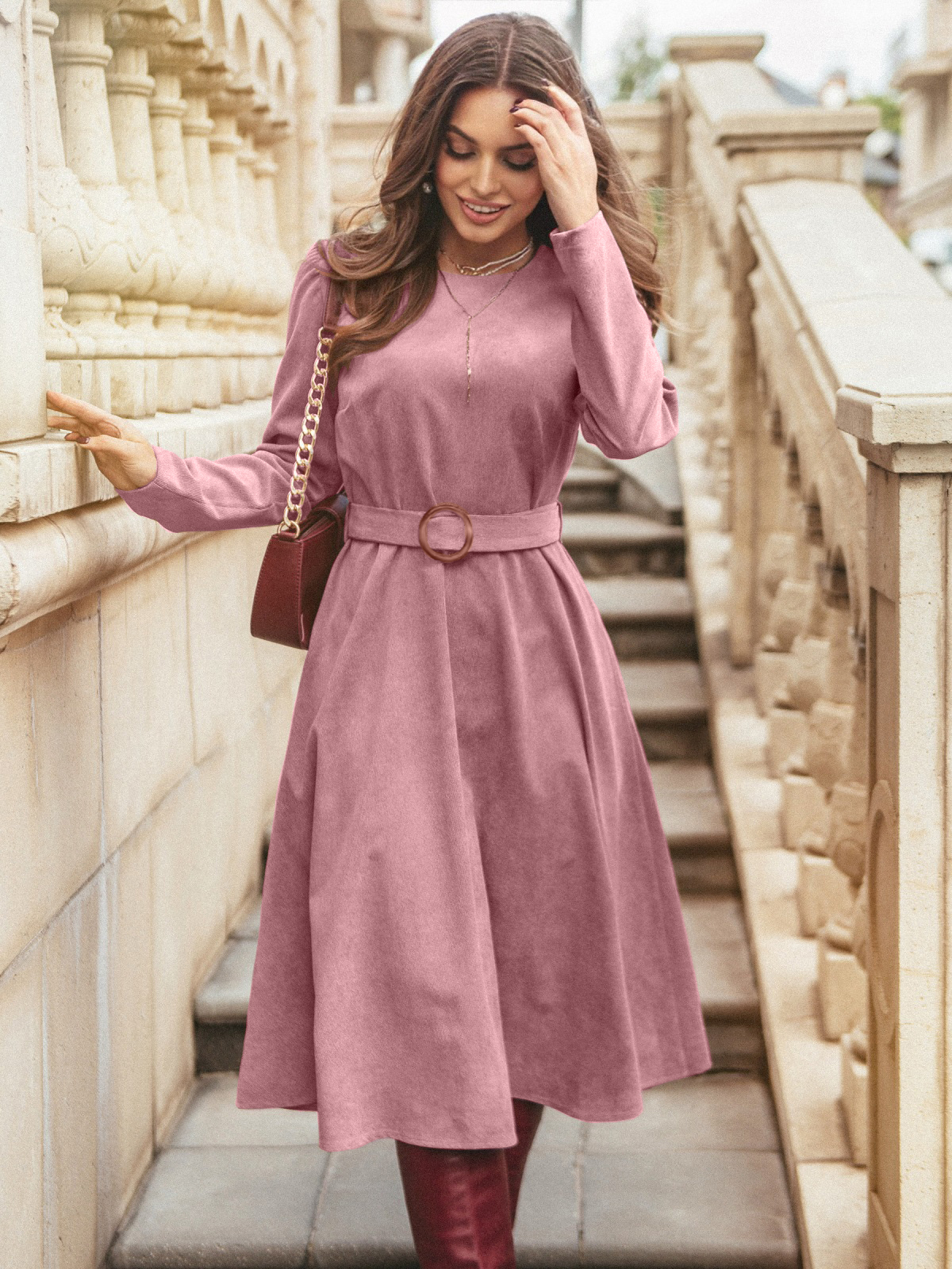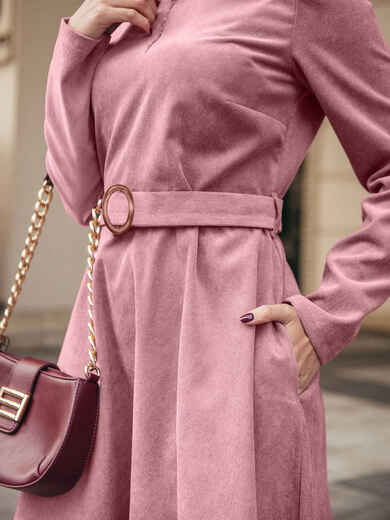 Сукня з мікровельвету з розкльошеною спідницею. Модель із круглою горловиною. По лінії грудей доповнена виточками. Застібається на приховану блискавку. Комплектується поясом із основного матеріалу.