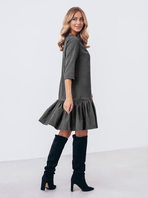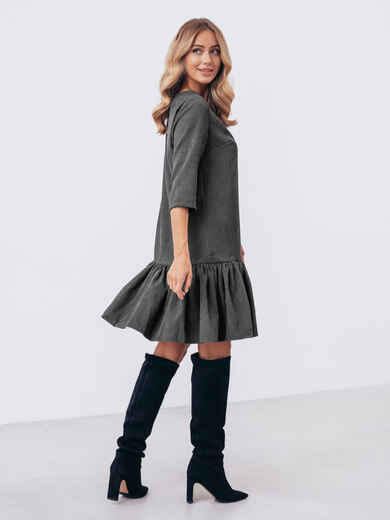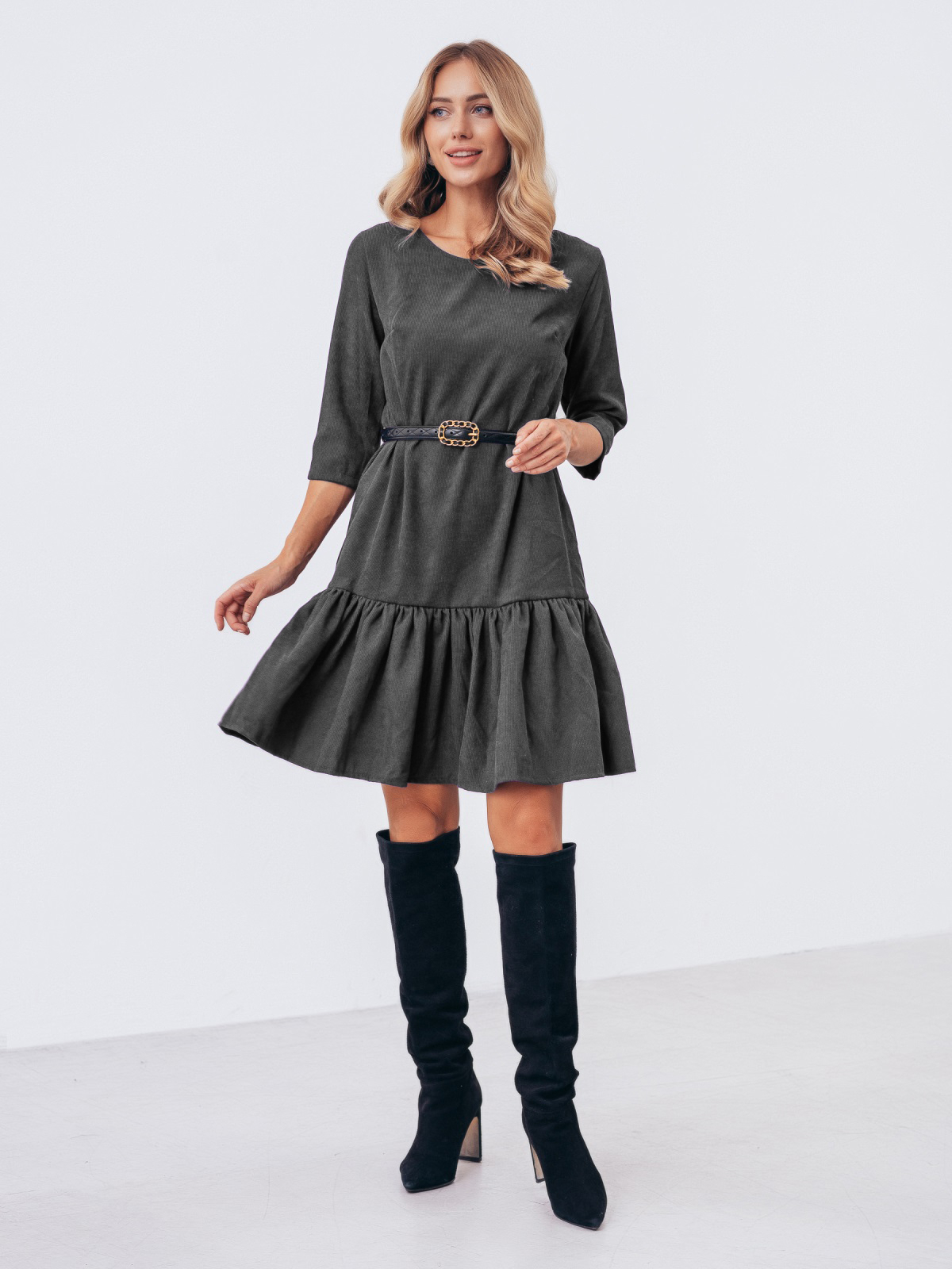 Сукня-трапеція із мікровельвету. Виріб з круглим вирізом горловини та рукавом ¾. Поділ доповнений воланом. Пасок в комплект не входить.