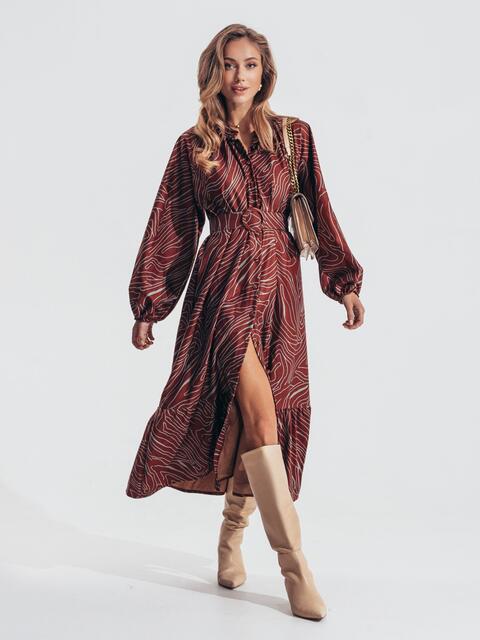 Коротка сукня в клітинку віші та з воланом внизу виробу. З V-подібним вирізом горловини. Лінія талії відрізана та доповнена шльовками. Комплектується поясом із основного матеріалу із пряжкою. Застібається на приховану блискавку по спинці.