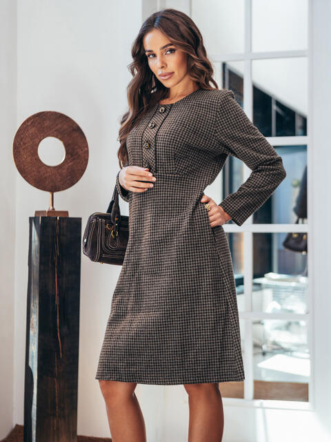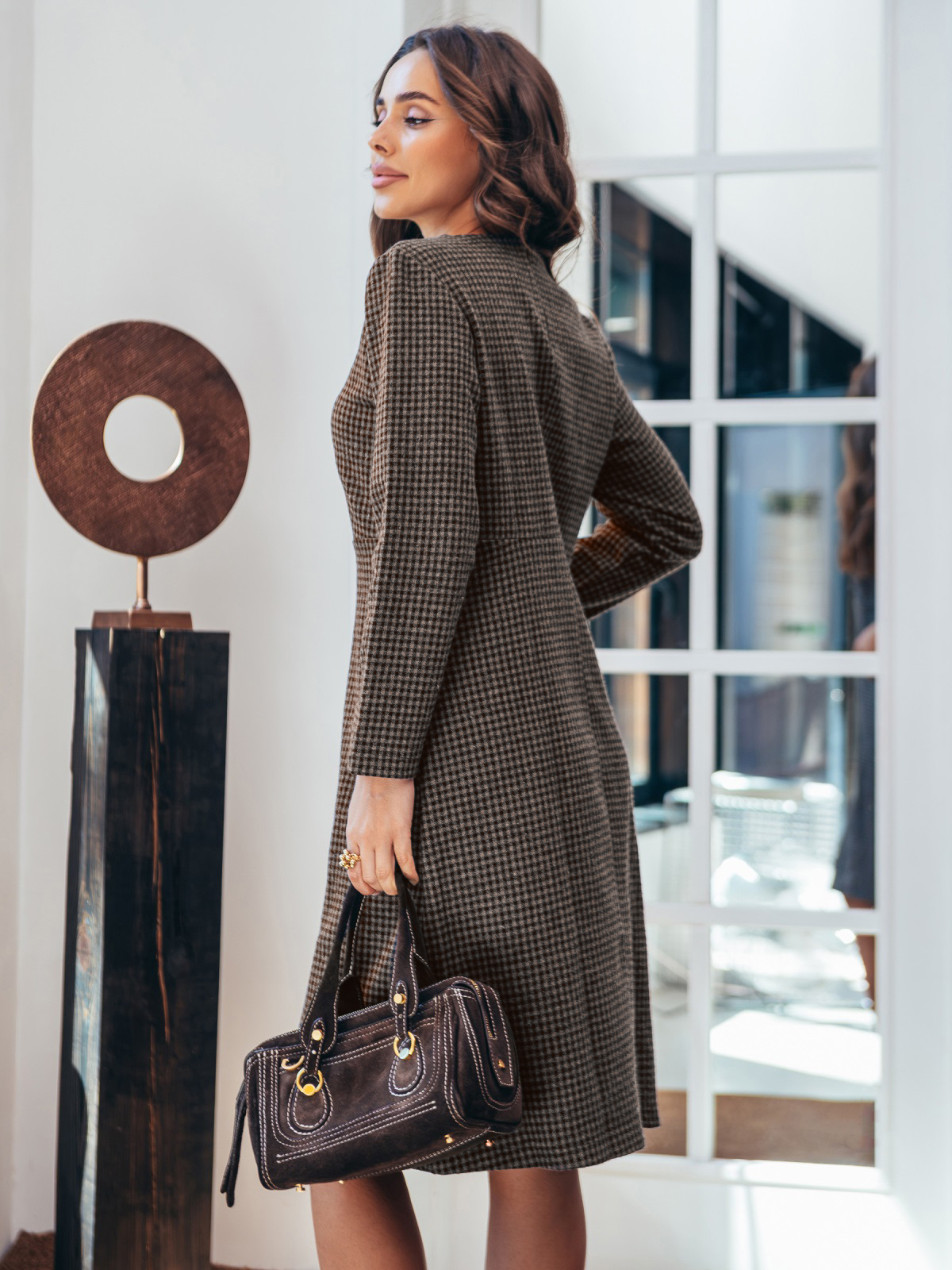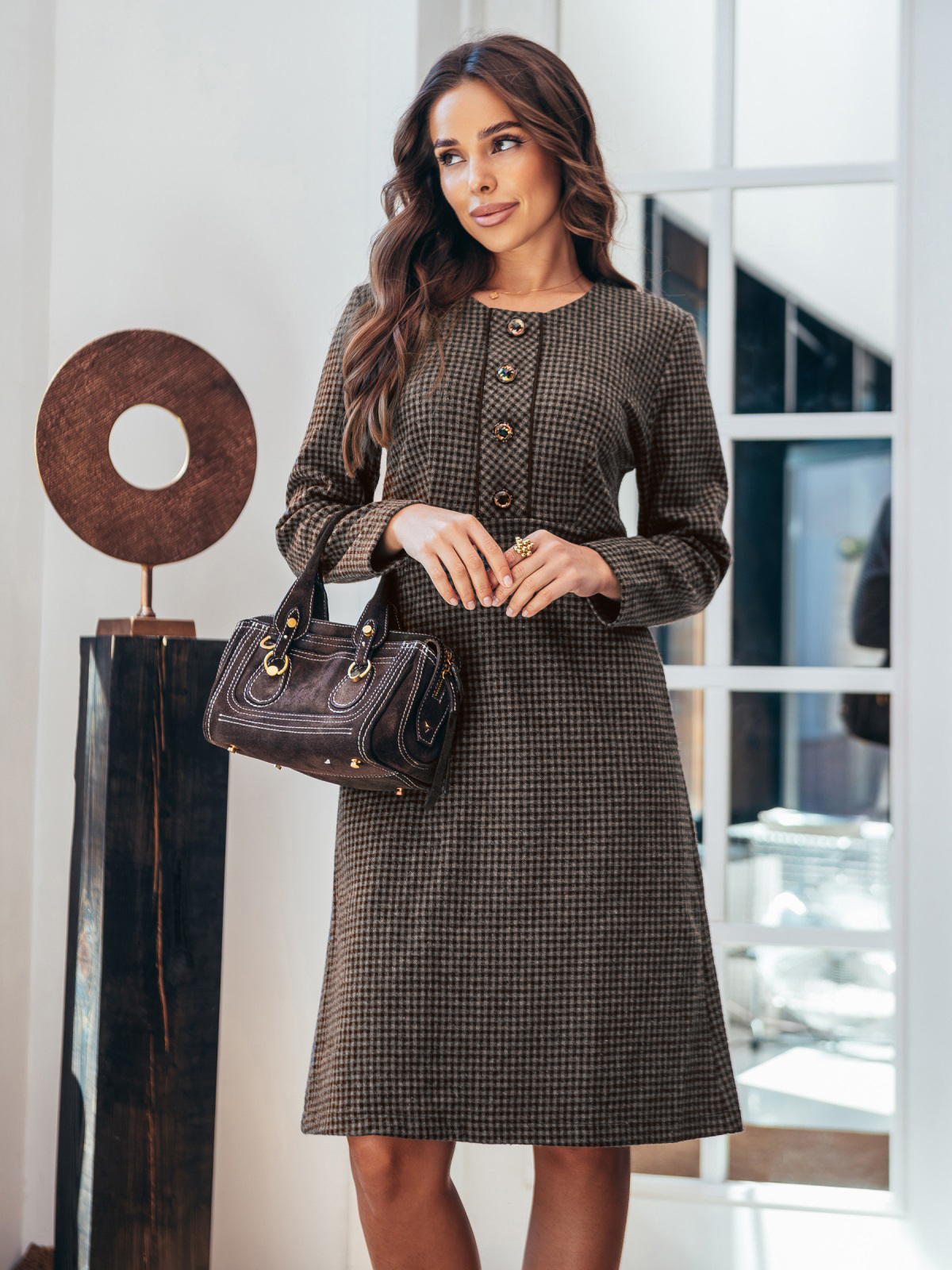 Сукня з жаккарду у дрібну клітинку. Виріб з круглою горловиною та довгими рукавами. Спереду планка з декоративними ґудзиками. Відрізна по талії. Вшиті кишені роблять модель практичною. Застібається на приховану блискавку ззаду.