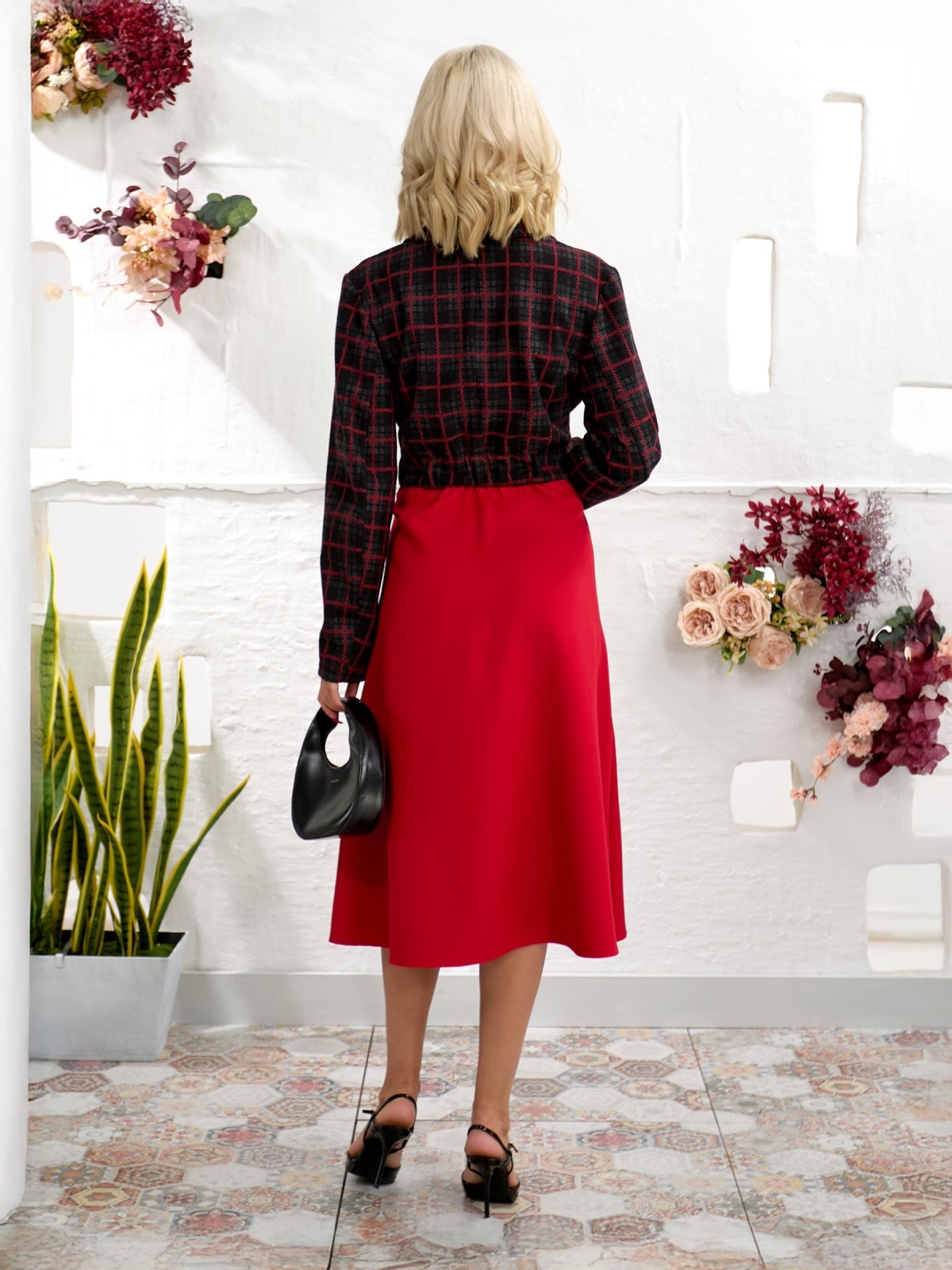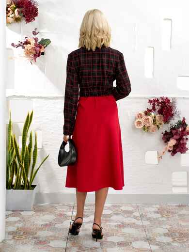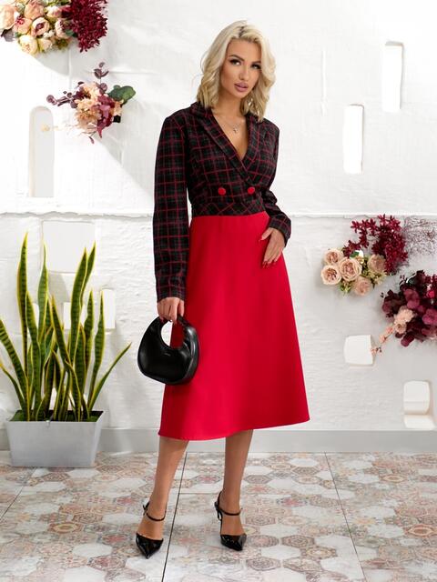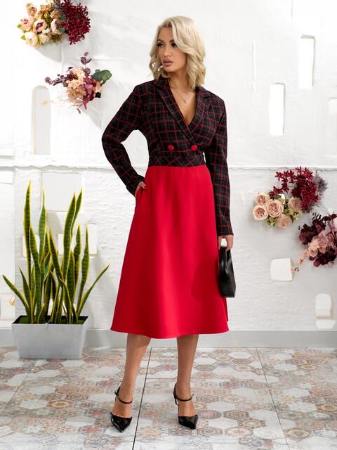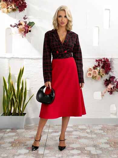 Сукня з жаккарду з класичним принтом в клітинку. Ліф з запахом фіксується на ґудзик, створюючи жіночний силует. Модель відрізна по талії, що підкреслює пропорції фігури. Ззаду талія доповнена гумкою. Спідниця виконана з м'якої замші-діагональ, доповнена бічними кишенями для зручності. Застібка збоку на приховану блискавку забезпечує акуратний вигляд.