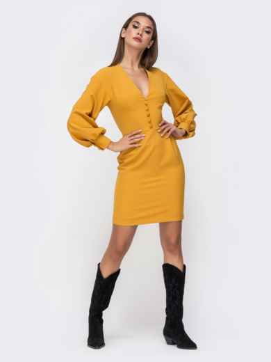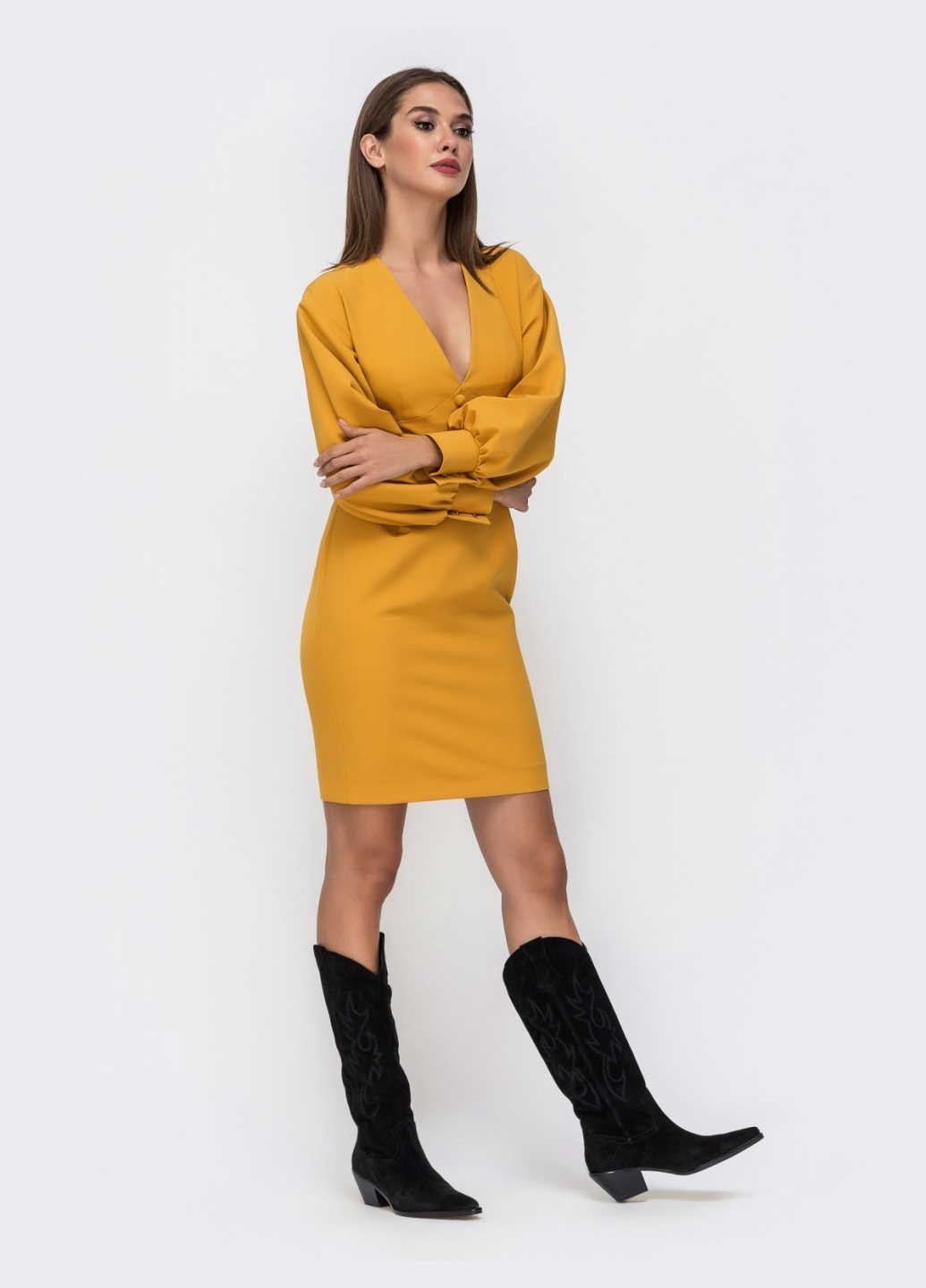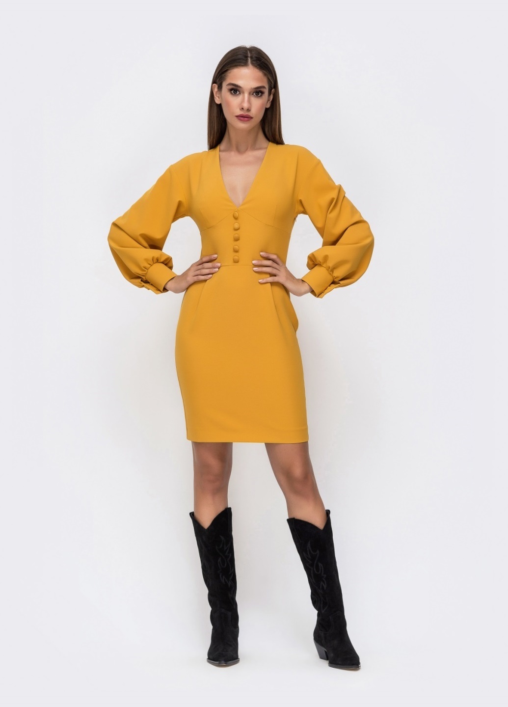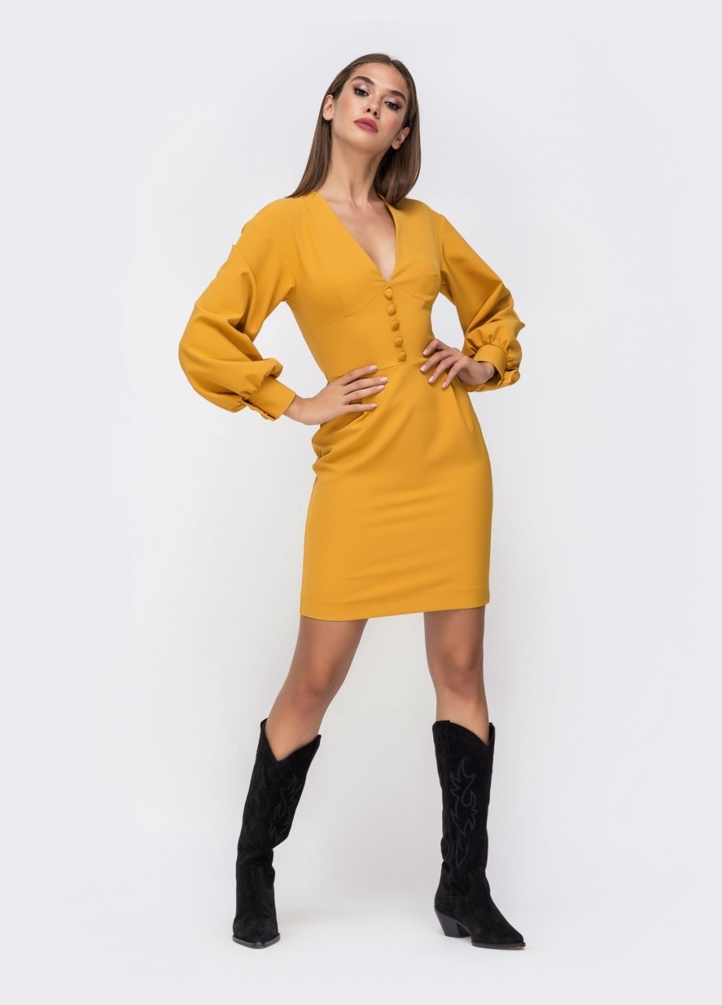 Яскрава сукня-футляр із костюмної тканини з декоративними гудзиками по поличці. Модель з V-подібним вирізом горловини та об'ємними рукавами. Застібається на блискавку збоку. Добре підійде типам фігури «пісочний годинник» та «прямокутник».