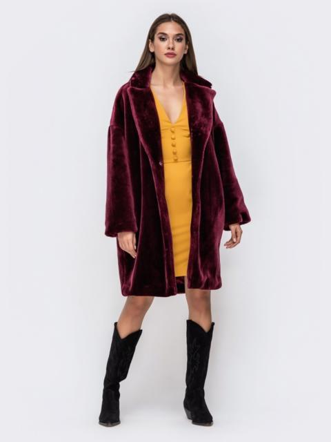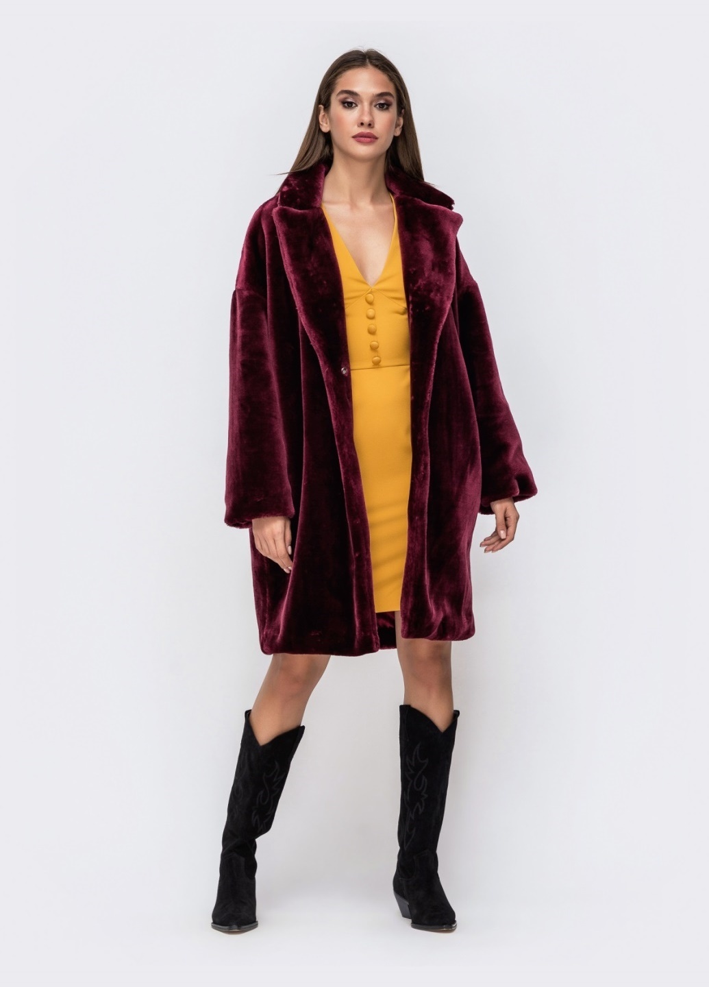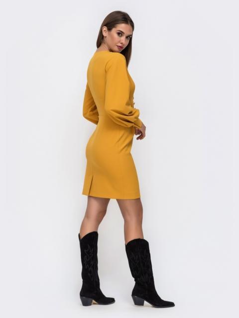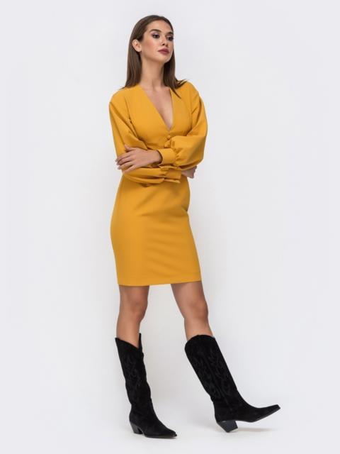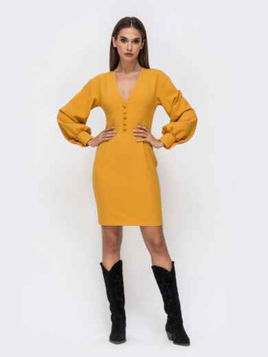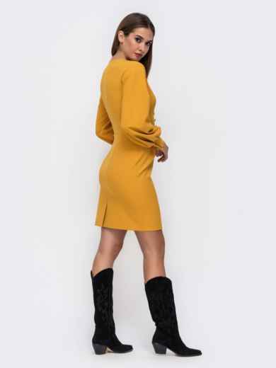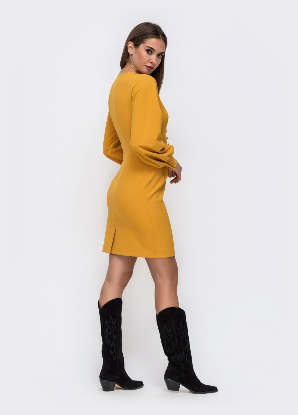Яскрава сукня-футляр із костюмної тканини з декоративними гудзиками по поличці. Модель з V-подібним вирізом горловини та об'ємними рукавами. Застібається на блискавку збоку. Добре підійде типам фігури «пісочний годинник» та «прямокутник».