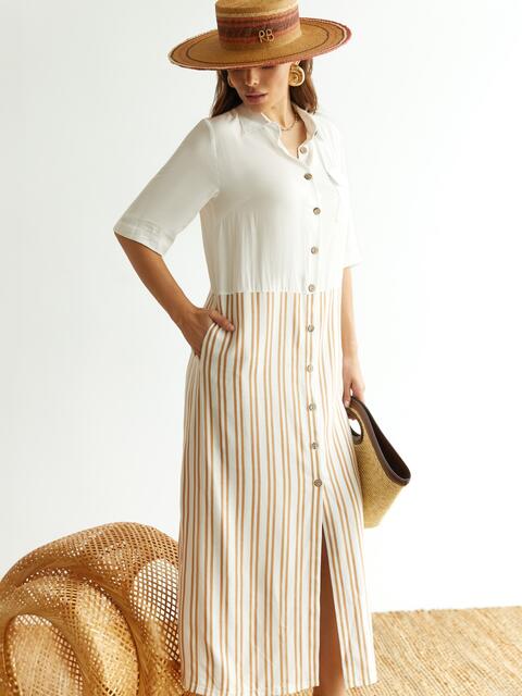 Стильна сукня-сорочка із високоякісного турецького матеріалу. Модель із відкладним коміром. Довгі рукави із манжетами. Відрізна по лінії талії. Поділ доповнений воланом. Застібається на супатну застібку на ґудзики.