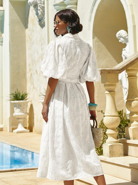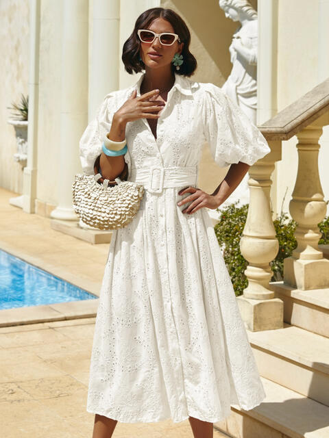 Сукня-сорочка з високоякісної прошви турецького виробництва вирізняється фактурним узором тканини та вишуканим кроєм. Короткі рукави-буфи з манжетами на гумці формують виразний об'єм у плечах.