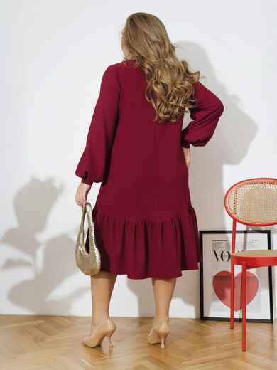 Сукня міді із трикотажу з люрексом. Модель з напівкруглим вирізом горловини і довгими рукавами з манжетами. На подолі сукні підшитий волан. По всій довжині спинки проходить шов. На грудях горизонтальні виточки. Прикраса входить в комплект.