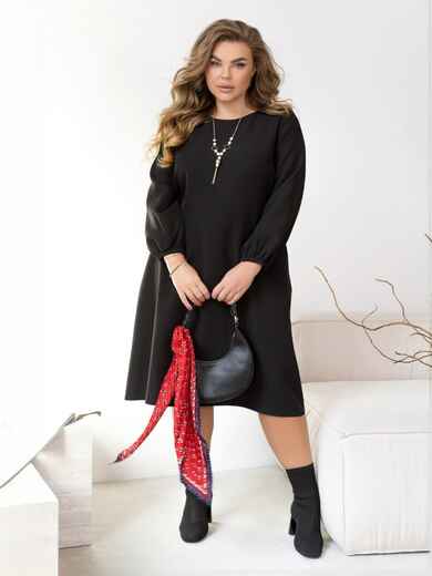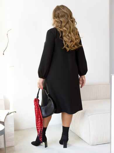 Плаття у вечірньому стилі вільного крою. Модель із об'ємним рукавом на гумці замість манжетів. У бічних швах рампоставлені кишені. Без застібок. Прикраса входить у комплект.