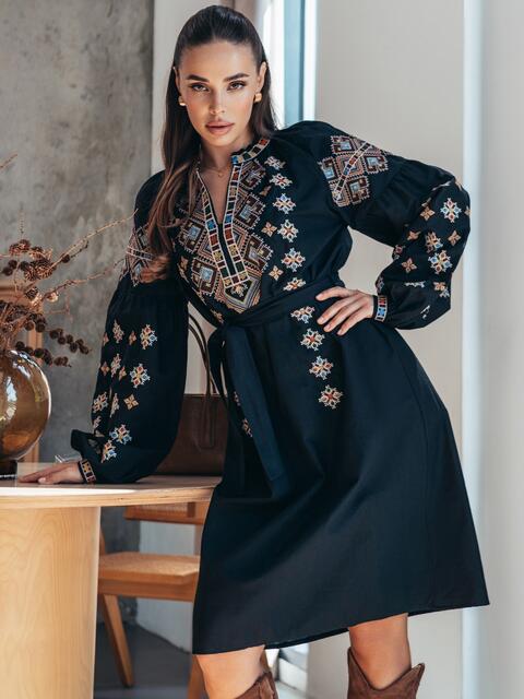 Сукня із високоякісного турецького матеріалу в етнічному стилі з виразною вишивкою. Модель вільного крою. V-подібний виріз підкреслює лінію декольте та візуально витягує силует. Довгі рукави з манжетами на гудзику. Пасок у комплекті..