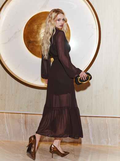 Повітряна сукня з високоякісного турецького шифону. Модель фіксується на талії за допомогою гумки, а розкльошена спідниця м'яко спадає по стегнах. Застібається ззаду на ґудзики. Комплектується комбінацією з регульованими бретелями і ременем.