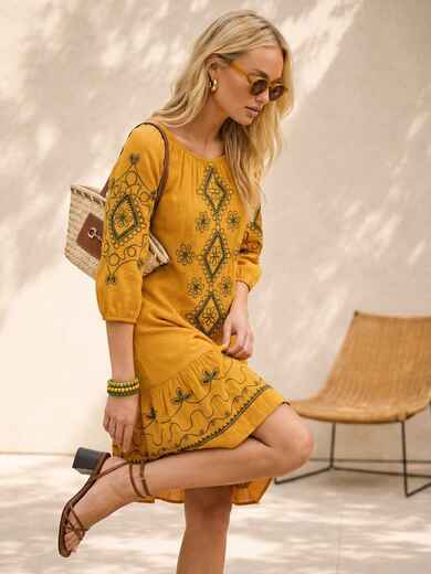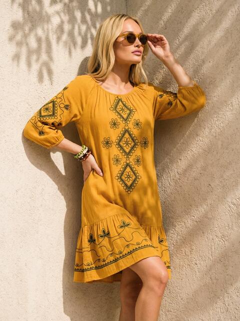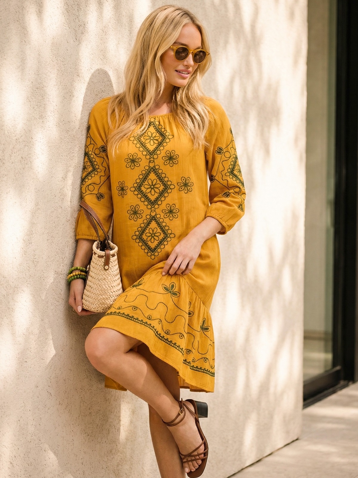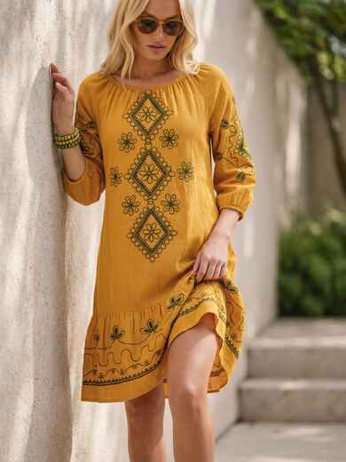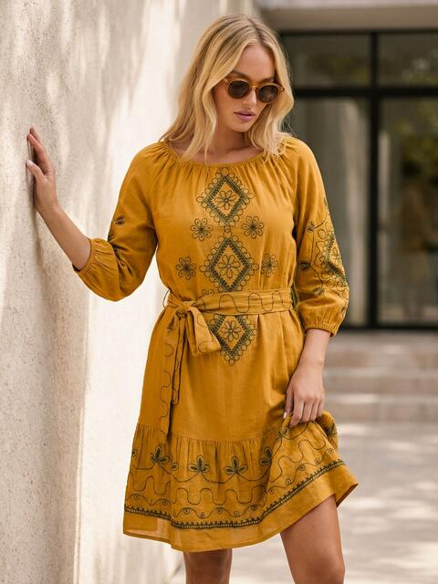 Гірчична сукня з темною вишивкою - поєднання, яке запам'ятовується з першого погляду.