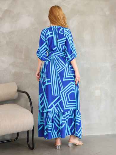 Принтована сукня-кльош з високоякісного турецького матеріалу. Виріб з коміром стійка та V-розрізом. Рукави ¾ з манжетами на резинці. Поділ доповнений воланом. Застібається на ґудзики по планці. Пояс у комплекті.