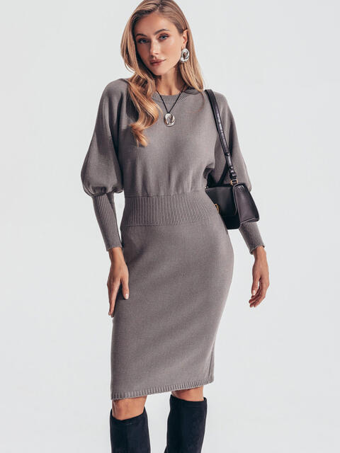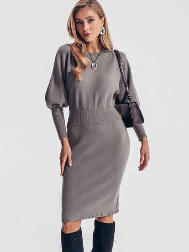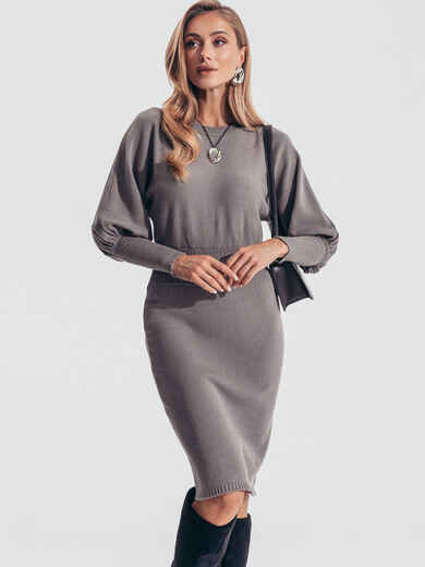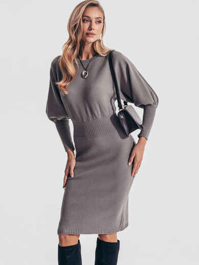Повсякденна сукня дрібної в'язки. Виріб з рукавами "летюча миша". По талії зв'язана гумкою.
