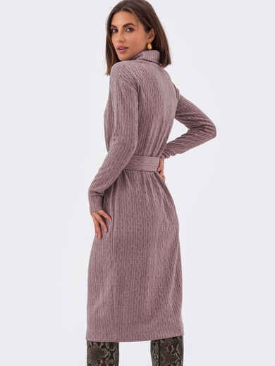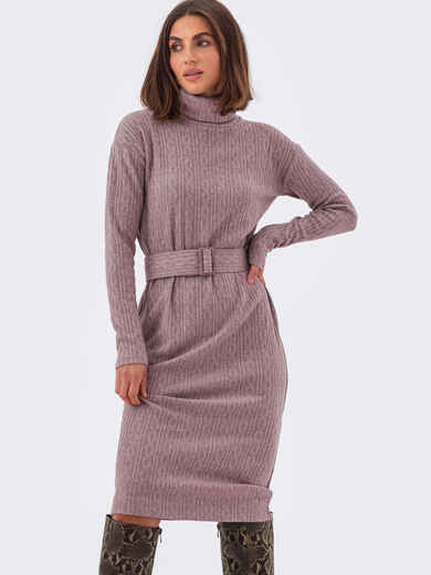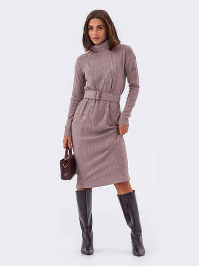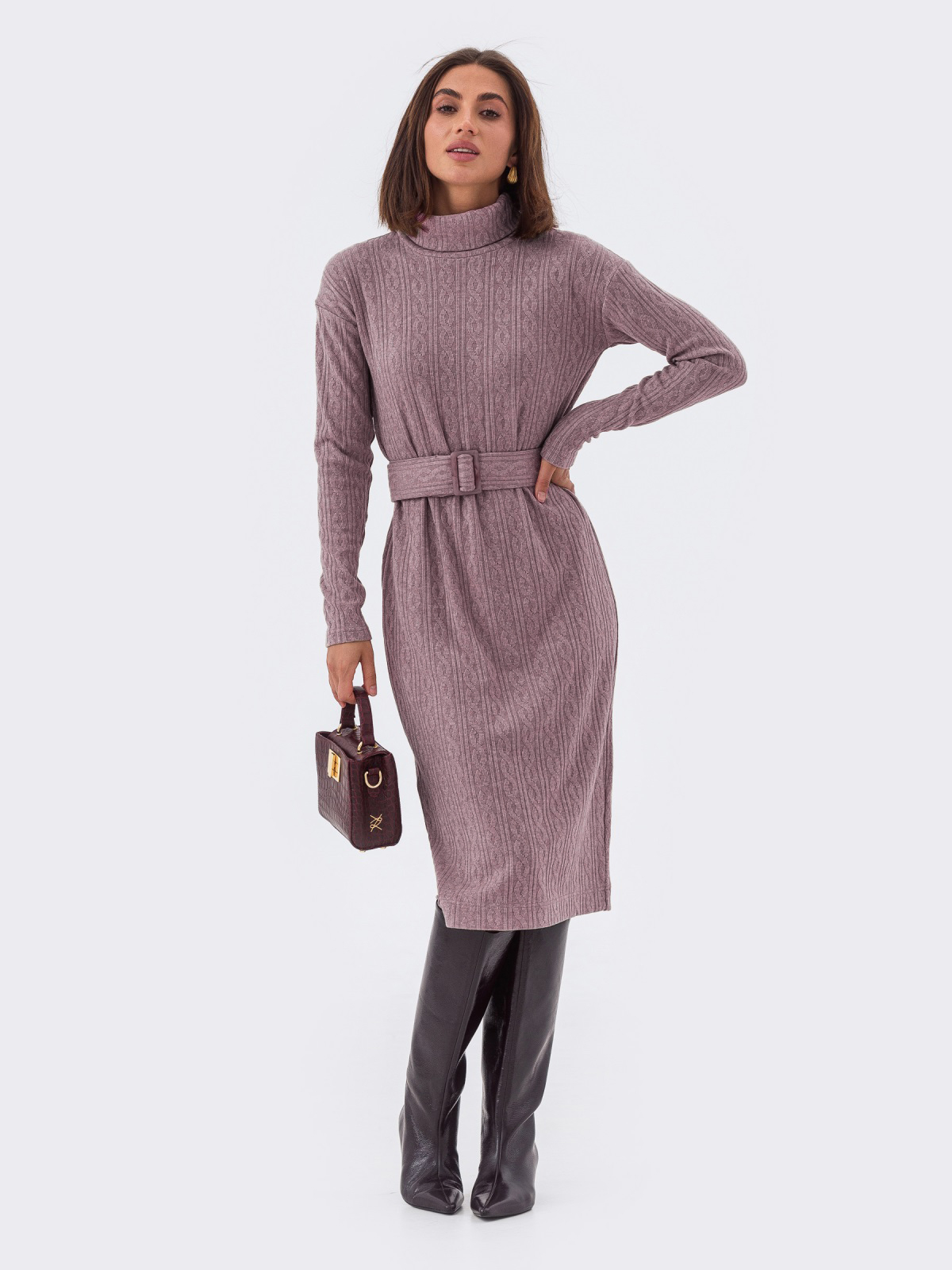Елегантна сукня-гольф із в'язаного трикотажу пудрового кольору з коричневим відтінком з косами. Виріб з високою горловиною та довгими рукавами. Комплектується поясом із основного матеріалу із пряжкою.
