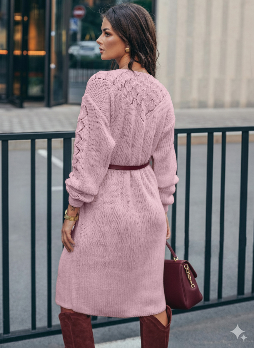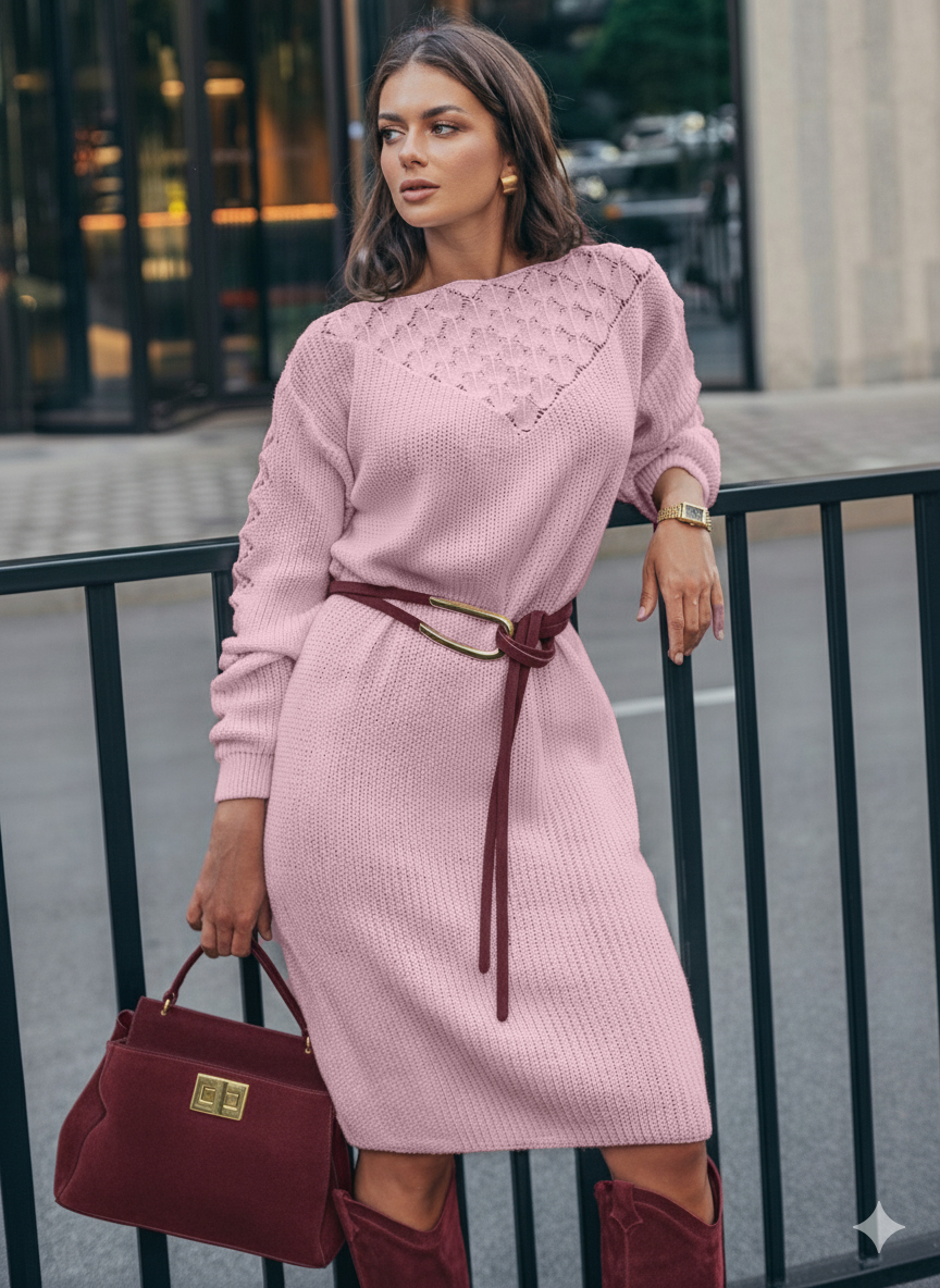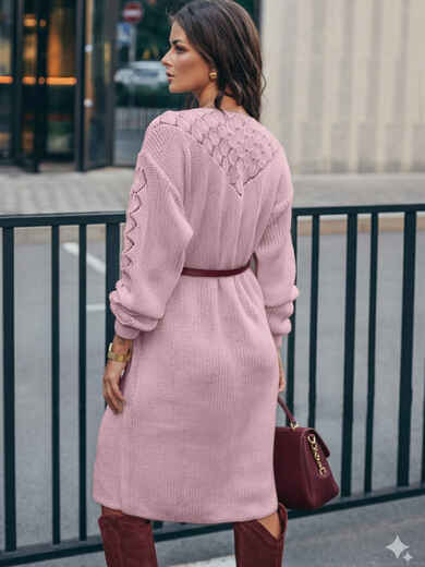 Сукня дрібної в'язки. Виріб з горловиною човник і довгими рукавами зі спущеним плечем. Поличка зв'язана фактурним трикутником. Пояс у комплект не входить.