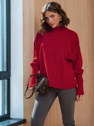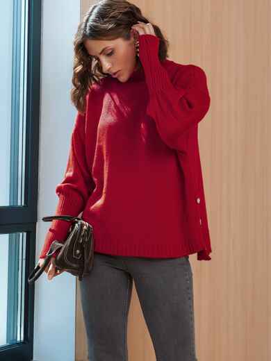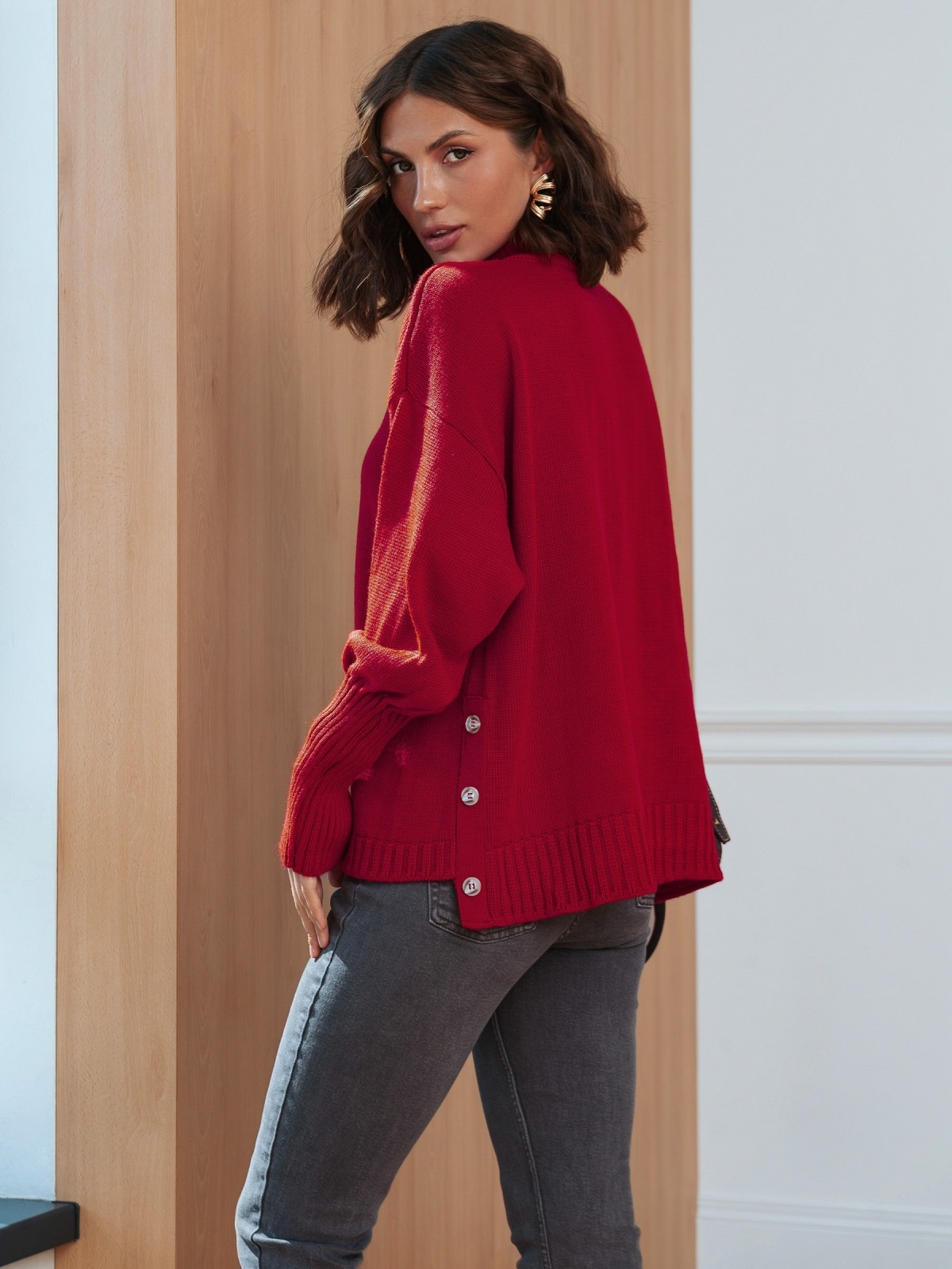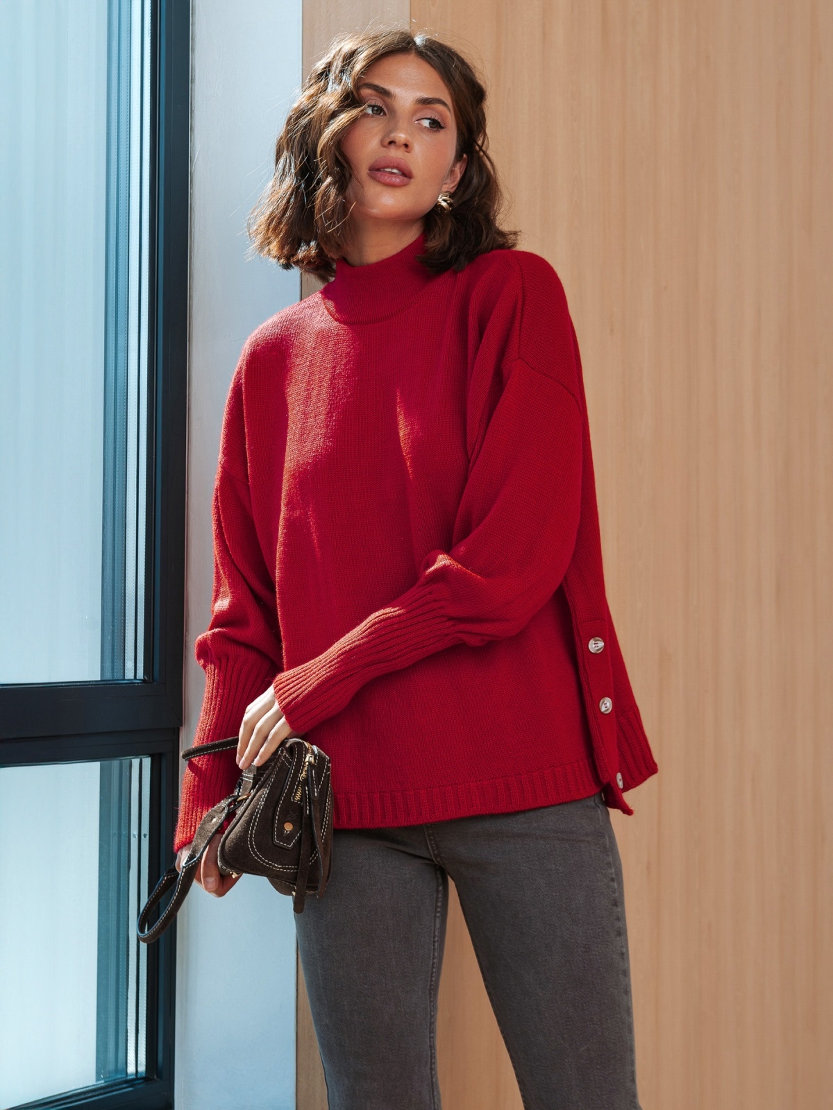 Светр вільного силуету з високим коміром-стійкою, що забезпечує тепло. Довгі, об'ємні рукави закінчуються високими манжетами. Особливістю моделі є ряд декоративних ґудзиків, розташованих уздовж бокового шва, які надають виробу унікальності. Злегка подовжений по спинці.