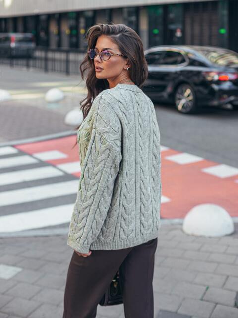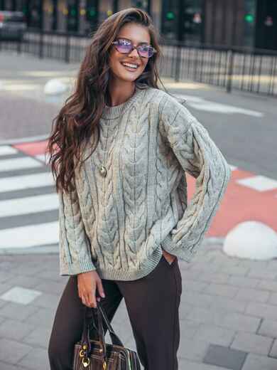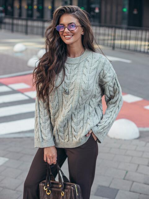Светр з м'якої пряжі з візерунком "коси". Прямий крій забезпечує зручну посадку. Круглий виріз горловини зв'язаний у техніці гумка. Довгі рукави додають практичності в холодну погоду.