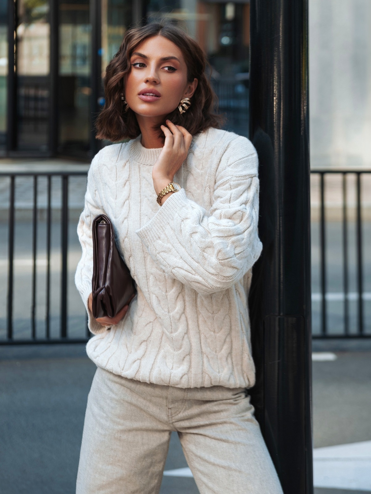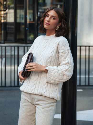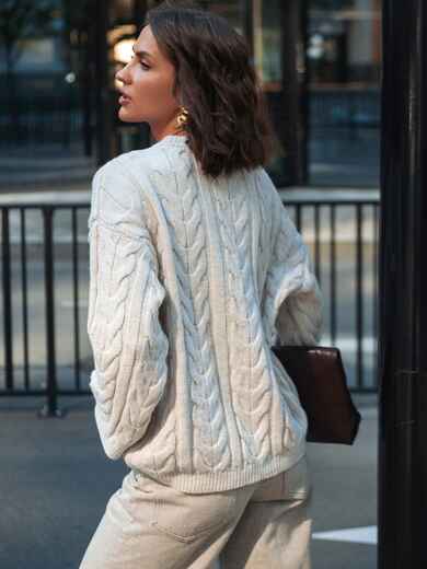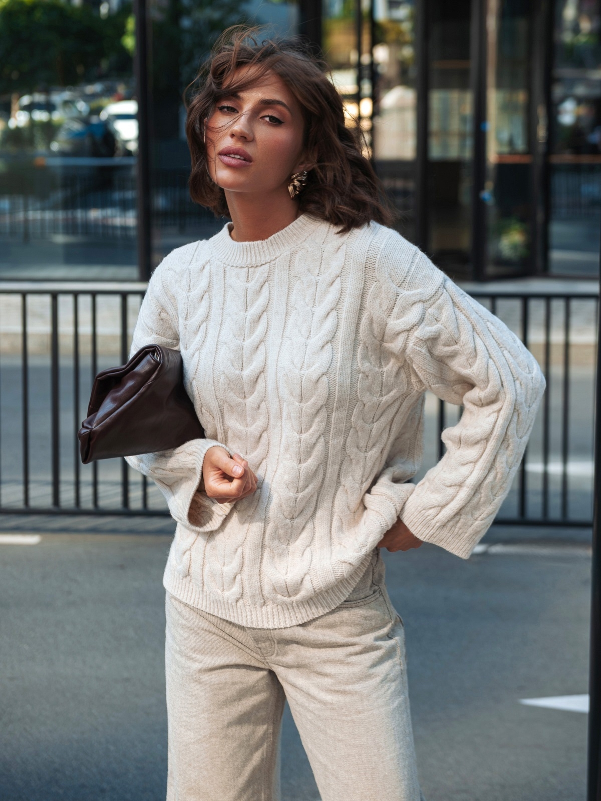 Светр з м'якої пряжі з візерунком "коси". Прямий крій забезпечує зручну посадку. Круглий виріз горловини зв'язаний у техніці гумка. Довгі рукави додають практичності в холодну погоду.