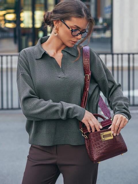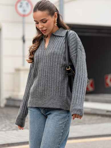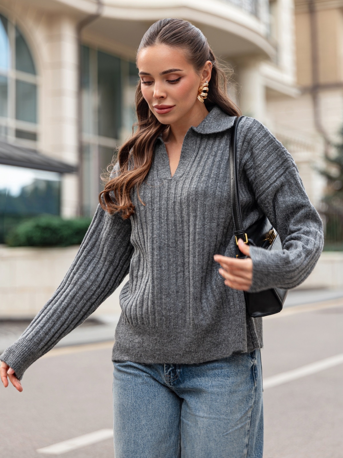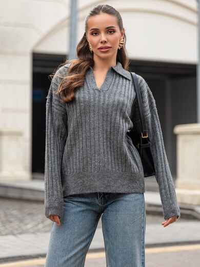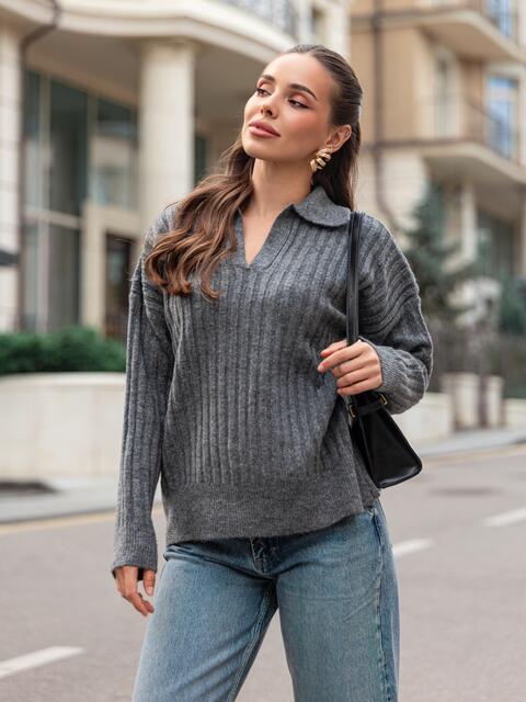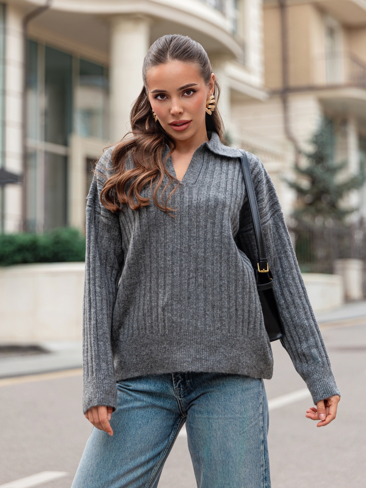 Светр дрібної в'язки в рубчик. Прямий вільний фасон забезпечує комфорт і свободу рухів протягом дня. V-подібна горловина з коміром-поло візуально витягує лінію шиї. Спущена лінія плеча формує розслаблений силует. Манжети і низ зв'язані у вигляді гумки.