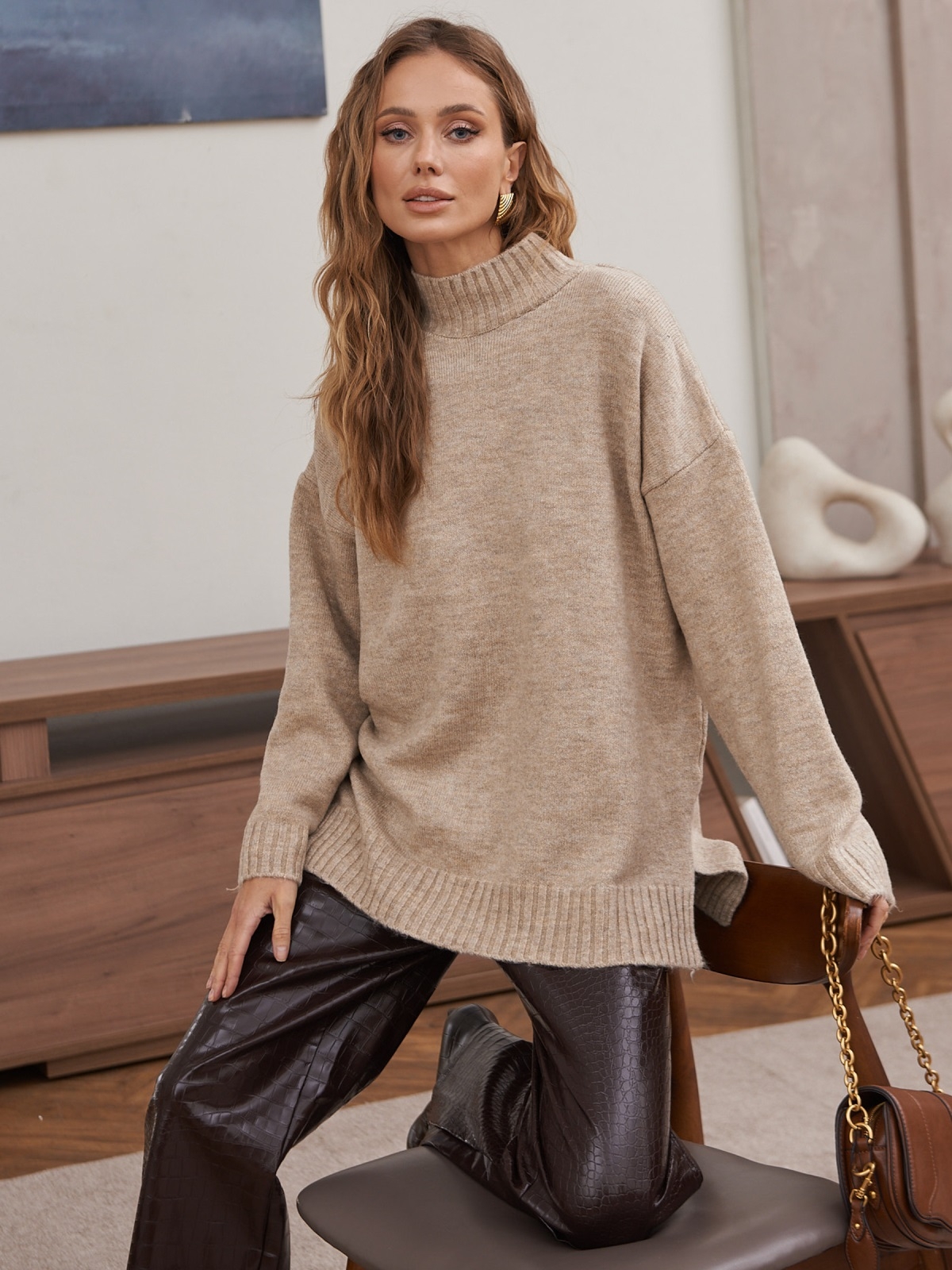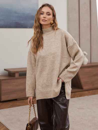 Подовжений по спинці светр дрібної в'язки. Виріб з високоякісного турецького матеріалу. Комір, манжети і низ зв'язані в техніці «гумка».