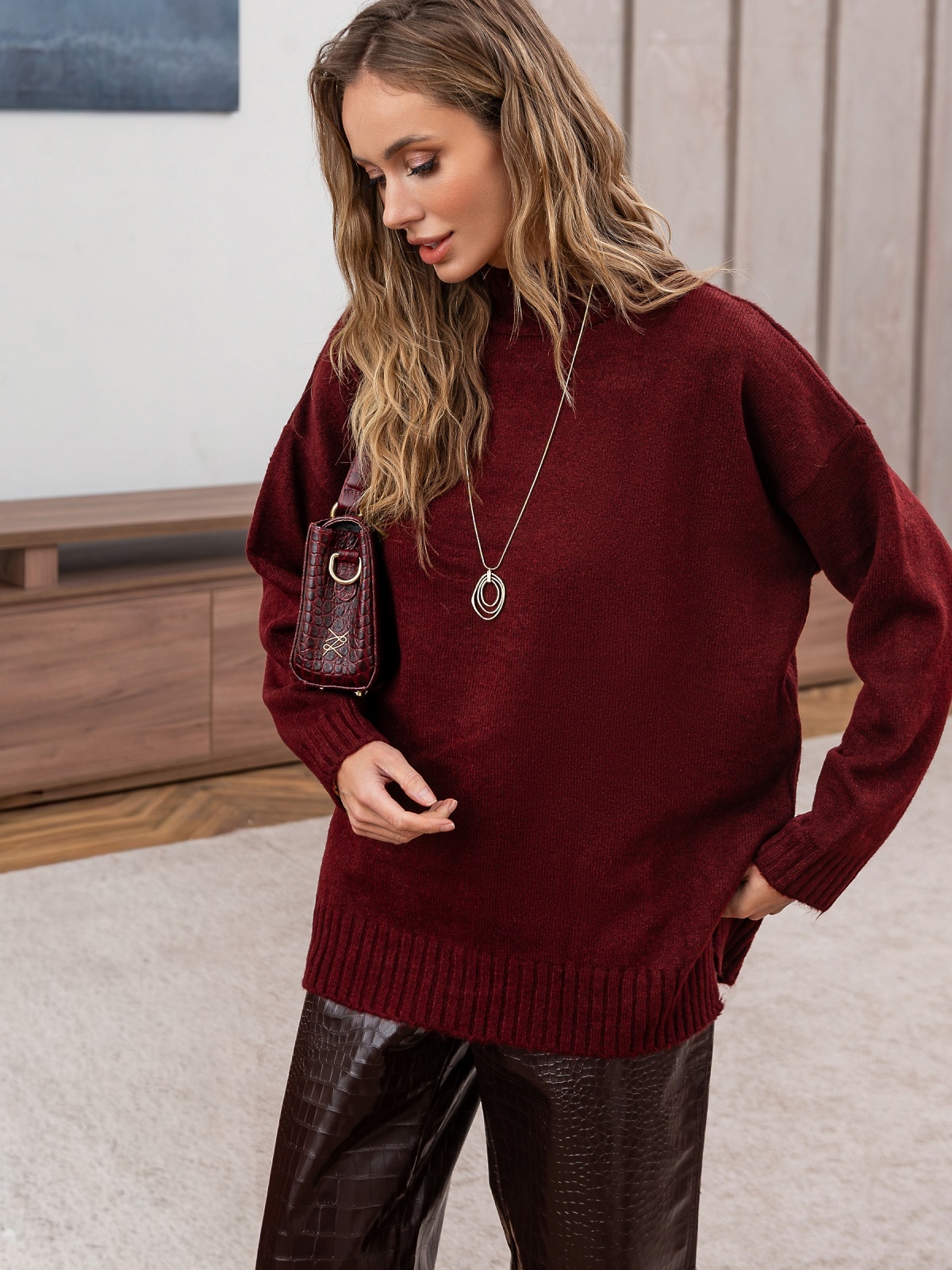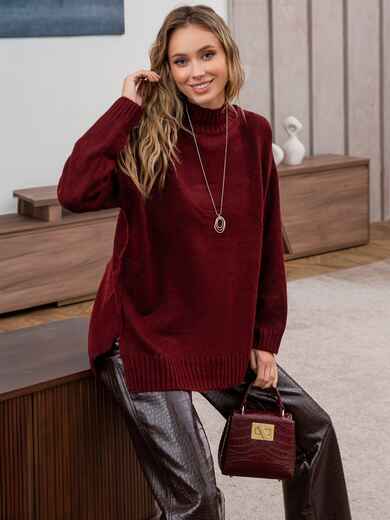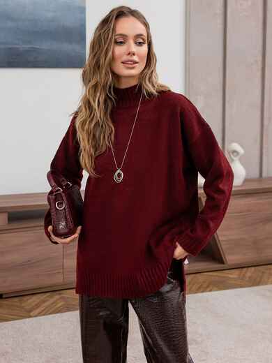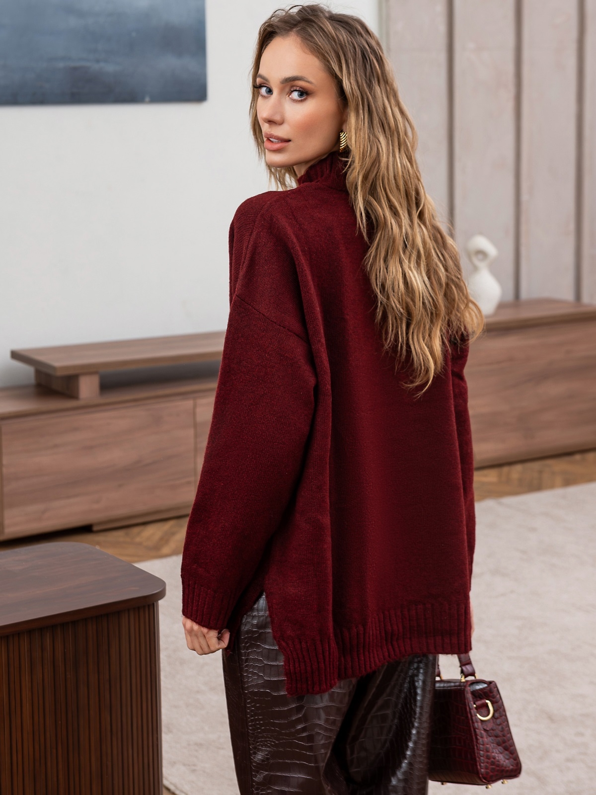 Подовжений по спинці светр дрібної в'язки. Виріб з високоякісного турецького матеріалу. Комір, манжети і низ зв'язані в техніці «гумка».