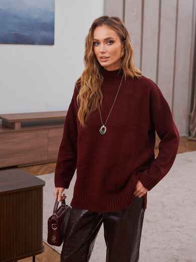 Подовжений по спинці светр дрібної в'язки. Виріб з високоякісного турецького матеріалу. Комір, манжети і низ зв'язані в техніці «гумка».