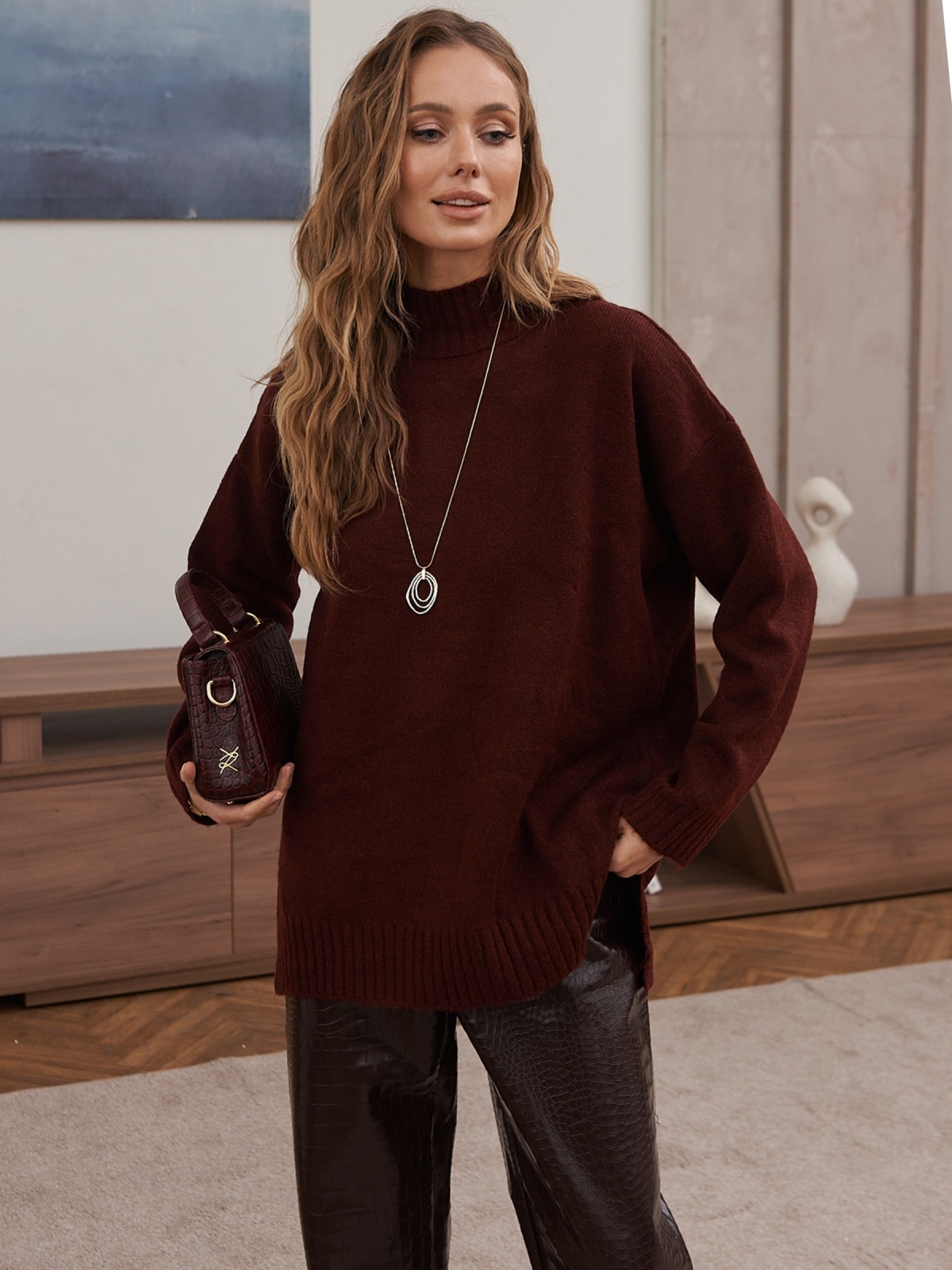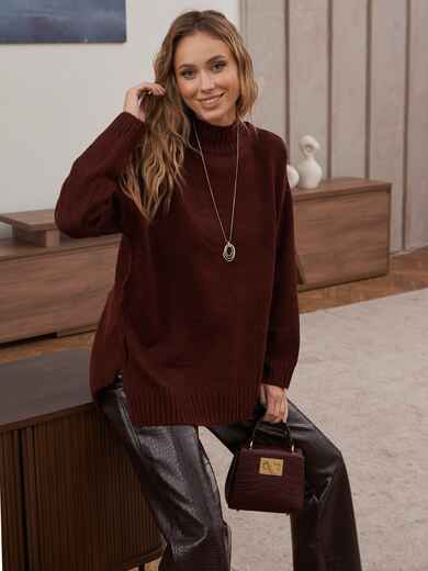 Подовжений по спинці светр дрібної в'язки. Виріб з високоякісного турецького матеріалу. Комір, манжети і низ зв'язані в техніці «гумка».