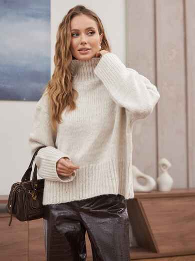 В'язаний светр з високоякісного турецького матеріалу з легким сірим відтінком. Модель вільного крою зі спущеною лінією плеча забезпечує комфорт. Високий комір-гольф захищає від холоду. Манжети і низ зв'язані в техніці «гумка».