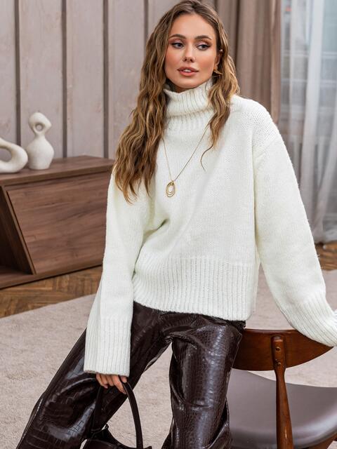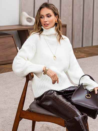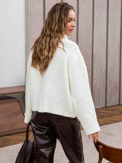В'язаний светр з високоякісного турецького матеріалу. Модель вільного крою зі спущеною лінією плеча забезпечує комфорт. Високий комір-гольф захищає від холоду. Манжети і низ зв'язані в техніці «гумка».