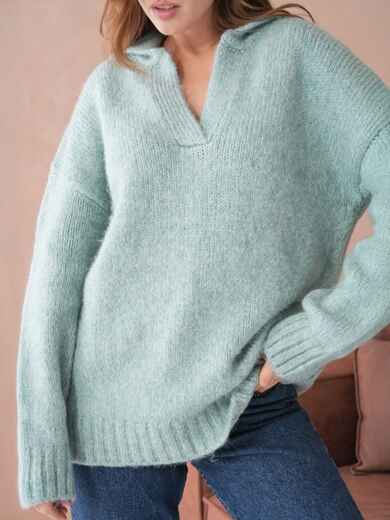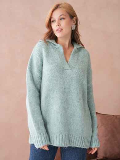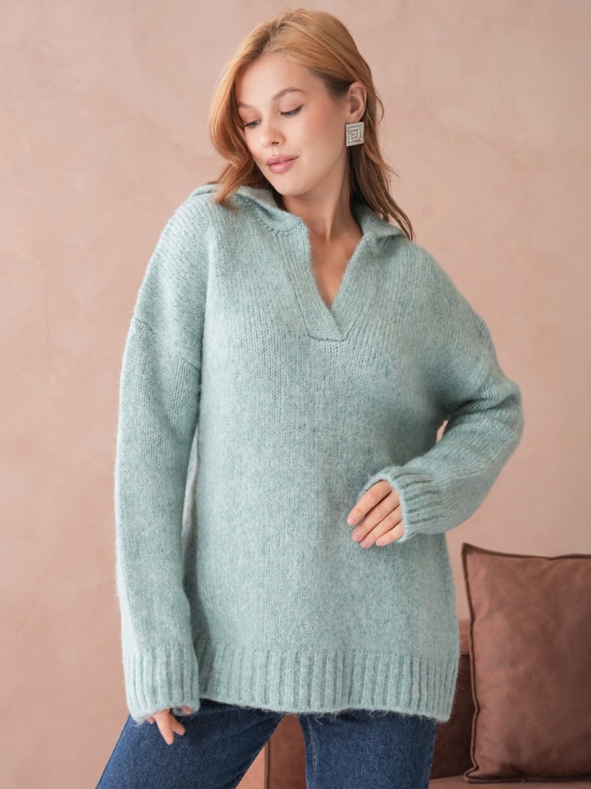 Светр із високоякісного турецького матеріалу. Модель з відкладним коміром та V-подібним вирізом. Подовжені рукави зі спущеним плечем.