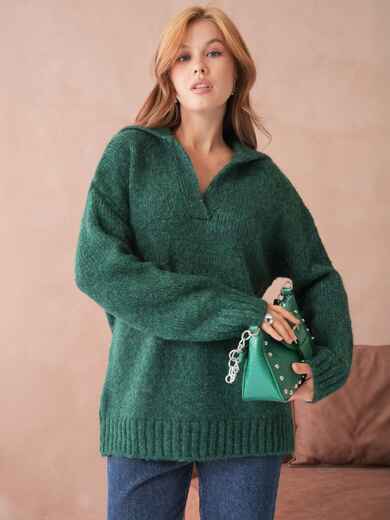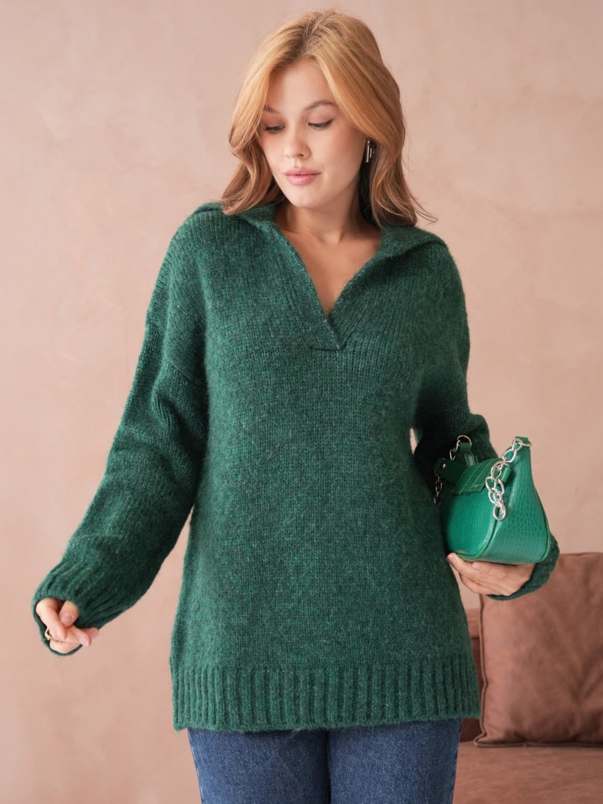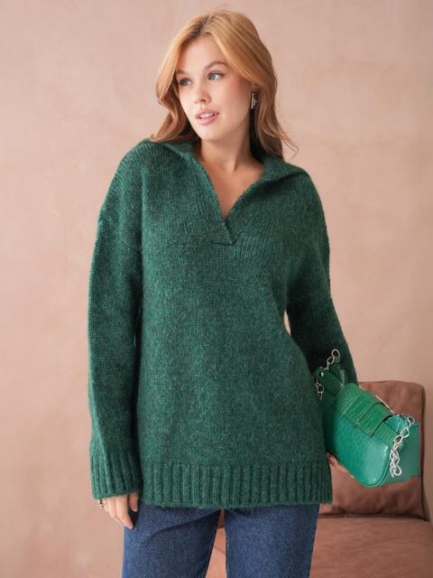 Светр із високоякісного турецького матеріалу. Модель з відкладним коміром та V-подібним вирізом. Подовжені рукави зі спущеним плечем.