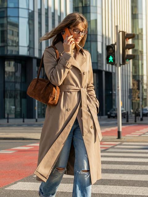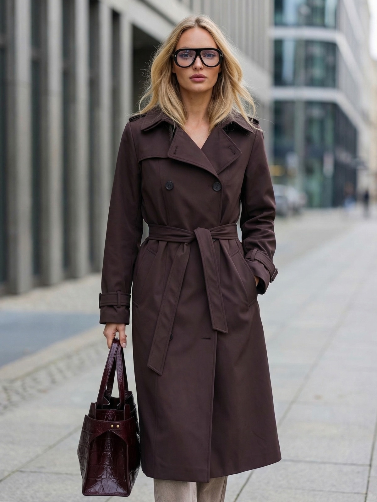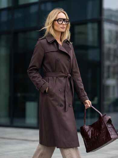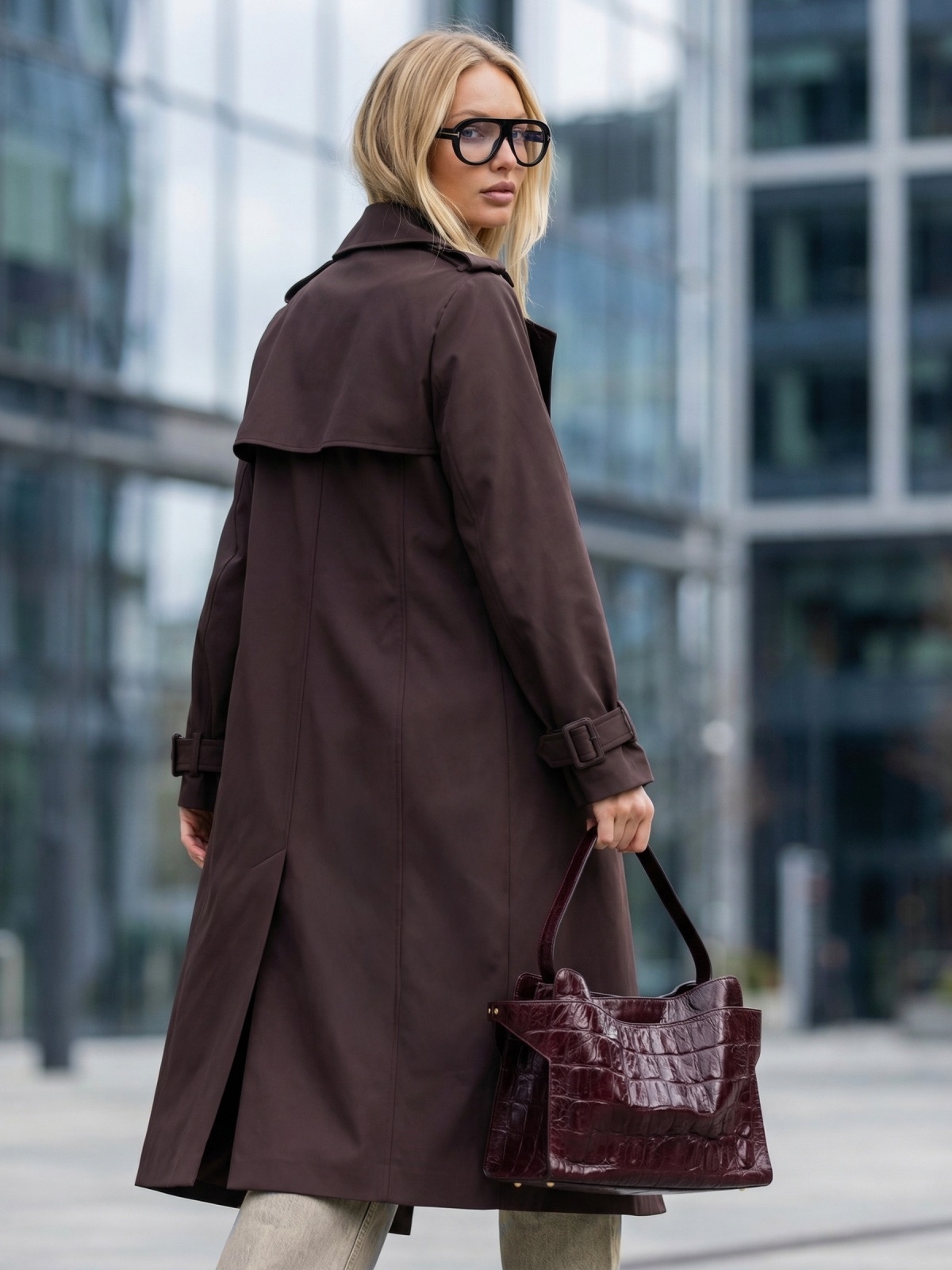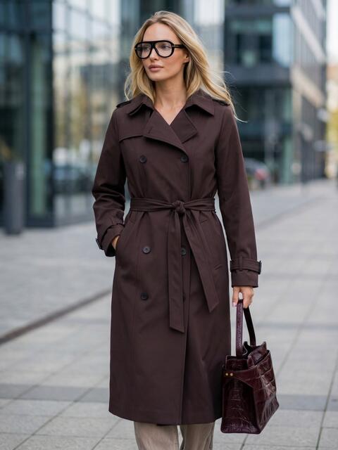 Двобортний тренч класичного крою з широким коміром і погонами на плечах. Виконаний із плащової тканини на інтерлоці. Пояс підкреслює талію та дозволяє регулювати посадку. Довжина міді, шліца ззаду. Застібається на ґудзики, є підкладка. Розрахований на температурний режим до +5°С.