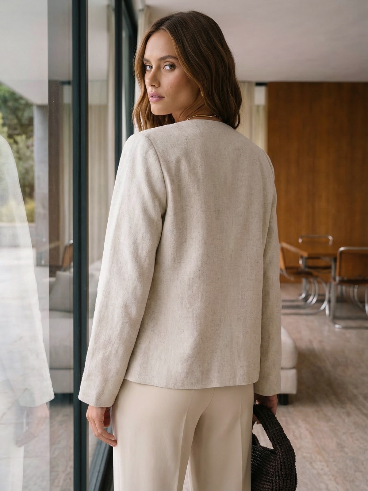 Підійде для офісу, ділових зустрічей та виходів у теплу пору року. Поверх чорної сукні або у парі зі світлими штанами - жакет стає головним акцентом образу без жодного аксесуару.