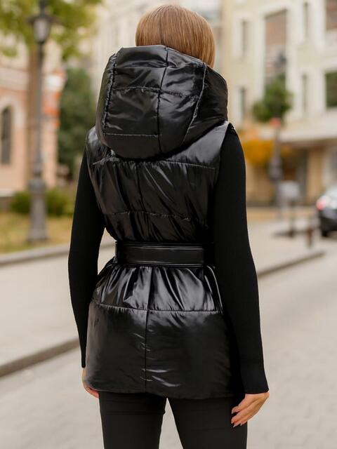 Стьобаний жилет з вшитим капюшоном. Доповнений прорізними кишенями із застібкою на блискавку. Застібається на кнопки. Комплектується поясом. Утеплювач – силікон 120. Розрахований на температурний режим від 0°C до +10°C.