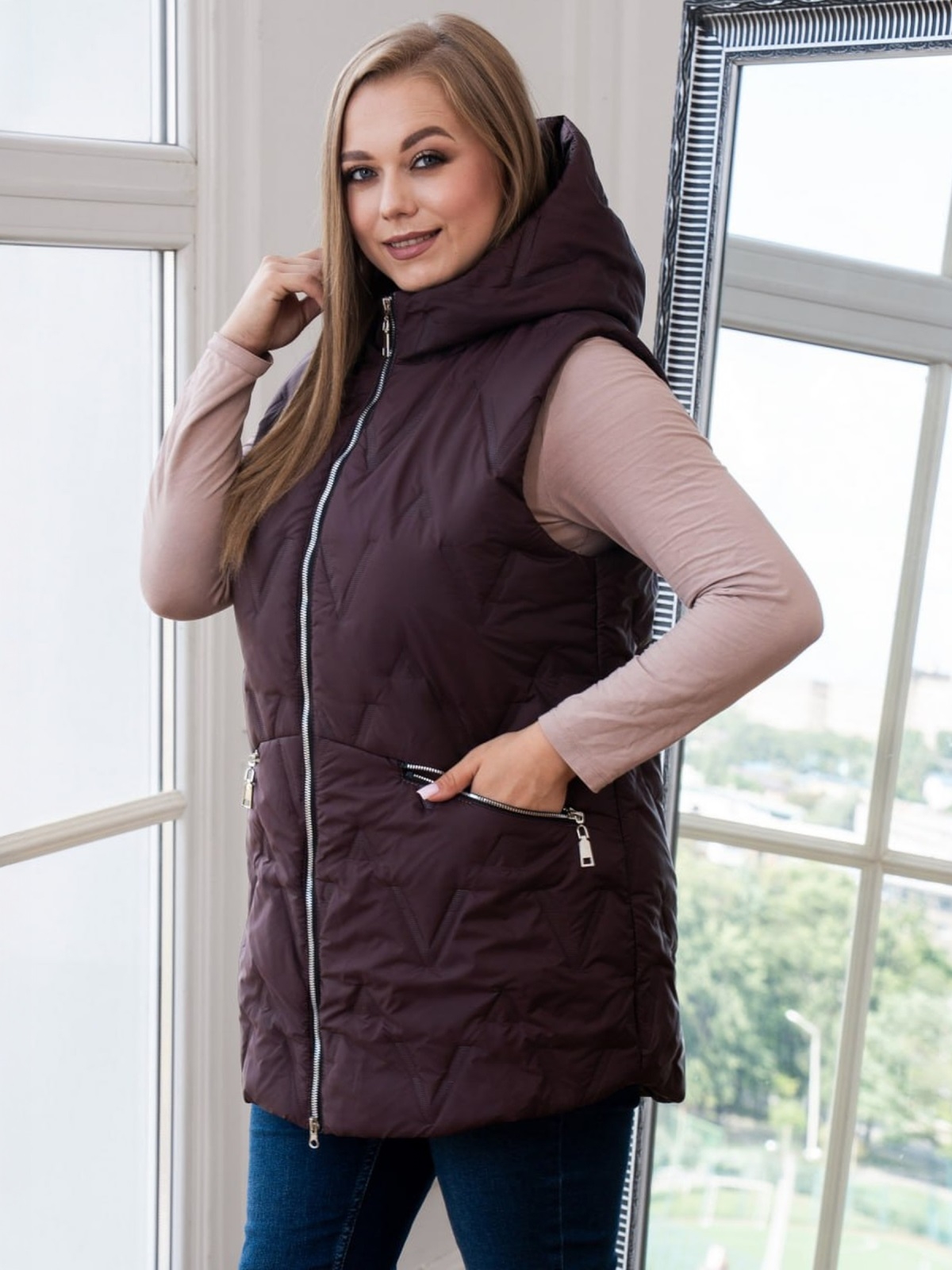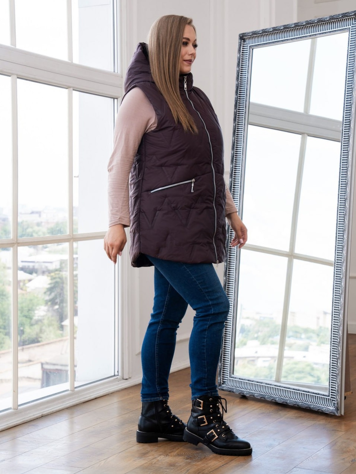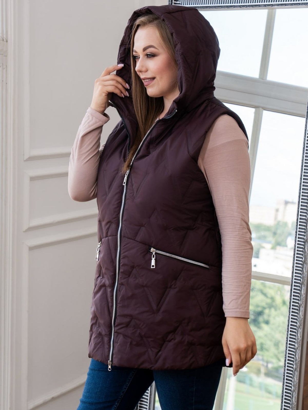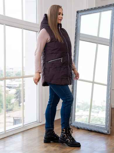Жилет з вшитим каптуром та високим коміром. З прорізними кишенями на блискавці. Поділ заокруглений. Доповнений підкладкою із нейлону. Застібається на пластикову блискавку з двома бігунками. Утеплювач — силікон 120. Розрахований на температурний режим до 0°С.