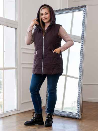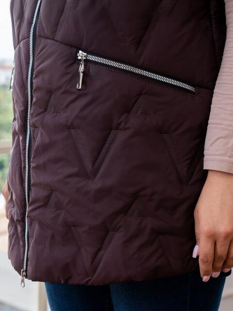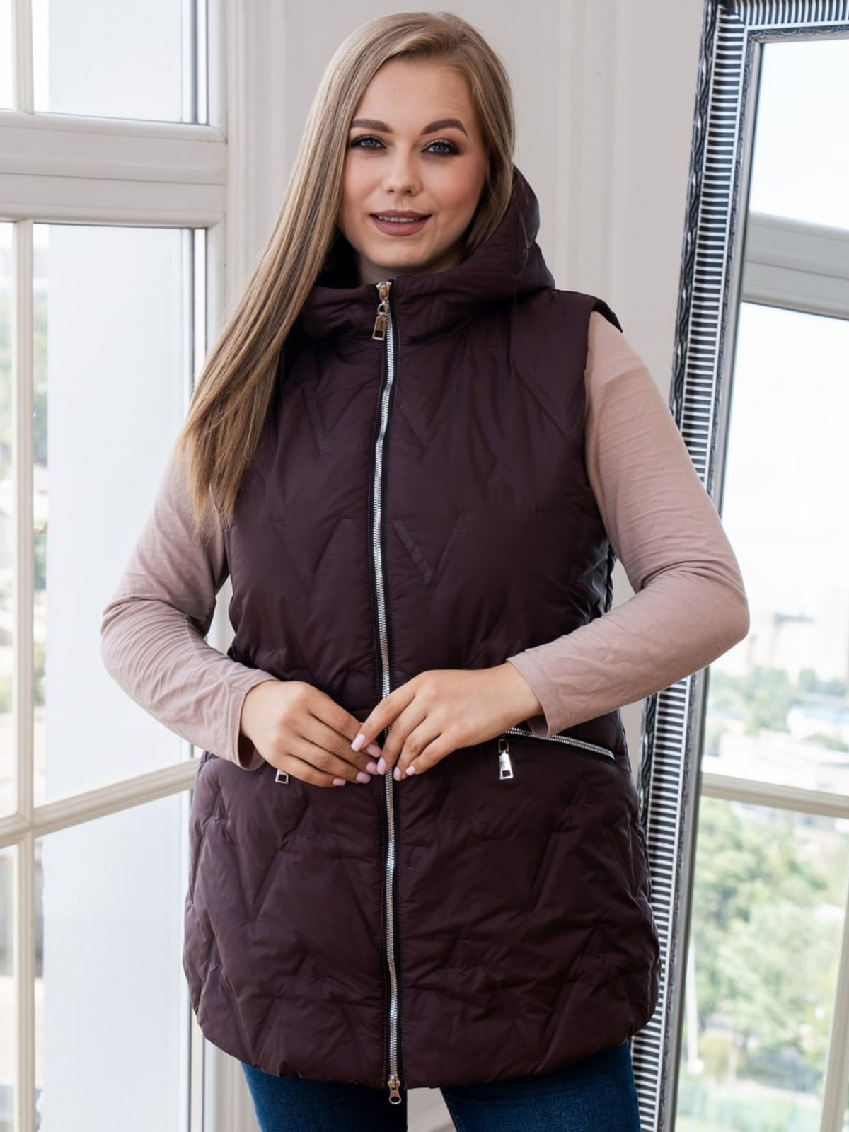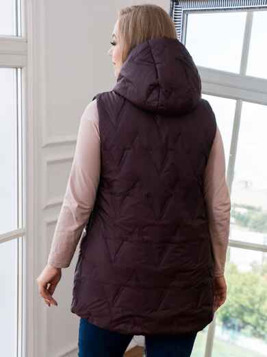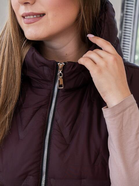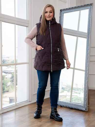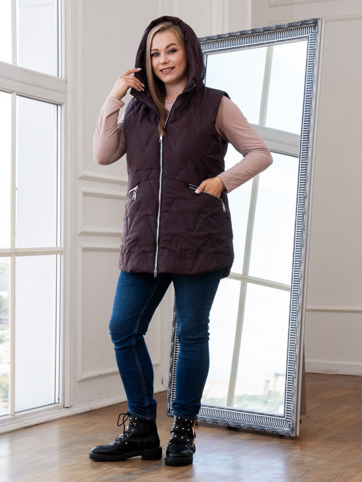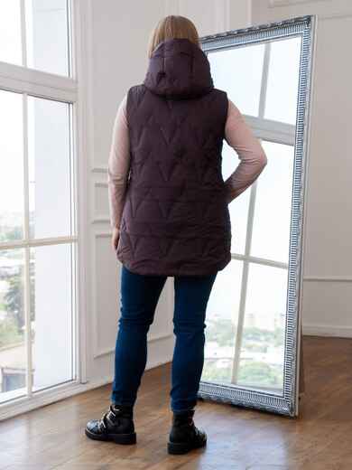 Жилет з вшитим каптуром та високим коміром. З прорізними кишенями на блискавці. Поділ заокруглений. Доповнений підкладкою із нейлону. Застібається на пластикову блискавку з двома бігунками. Утеплювач — силікон 120. Розрахований на температурний режим до 0°С.