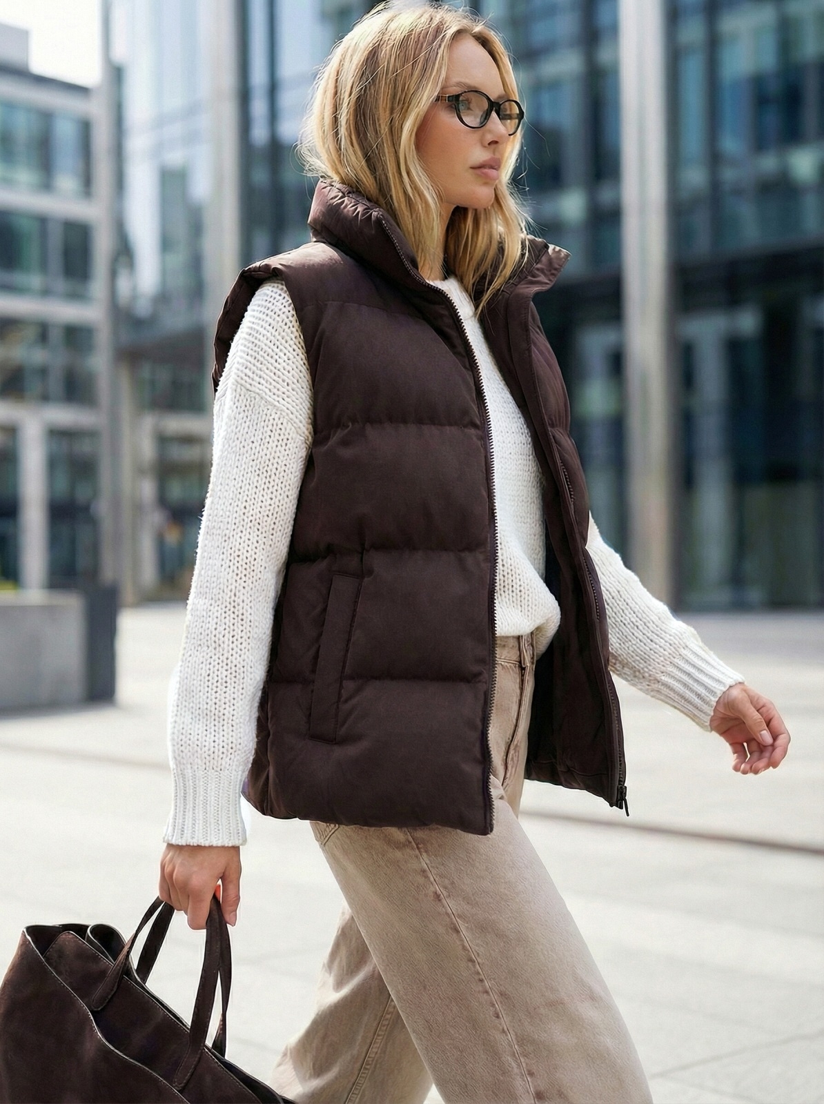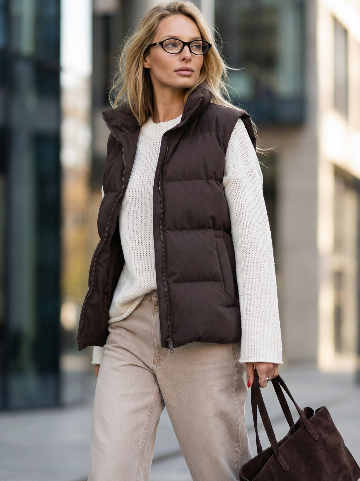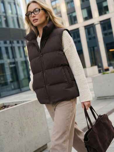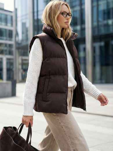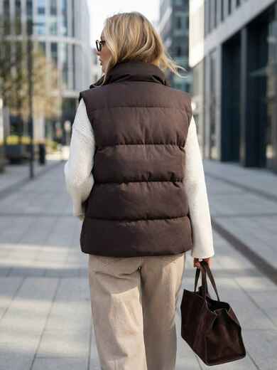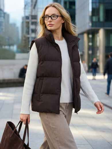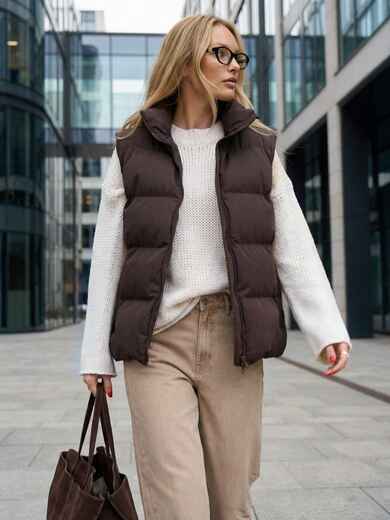 Жилет зі щільної плащівки з імітацією візерунка пальтової тканини. Модель доповнена високим коміром-стійкою, який добре захищає від вітру. Виріб застібається на блискавку по всій довжині, а з боків розташовані зручні прорізні кишені. Наповнювач біопух робить жилет легким, але теплим.