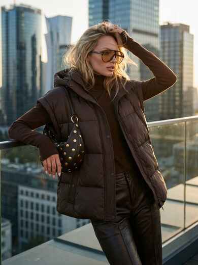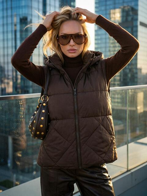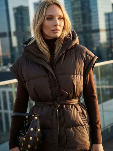 Жилет подовженого крою з поясом із основної тканини. Високий комір-стійка переходить у знімний капюшон з куліскою та фіксаторами для захисту від вітру. Доповнений прорізними кишенями. Застібається на блискавку та кнопки. Наповнювач - біопух. Підходить на температурний режим до -3°C.