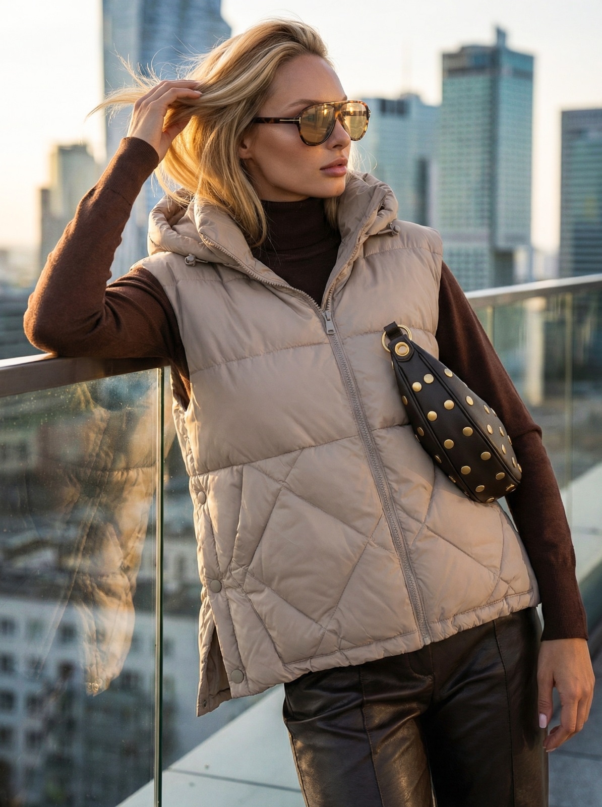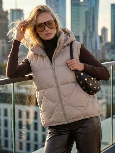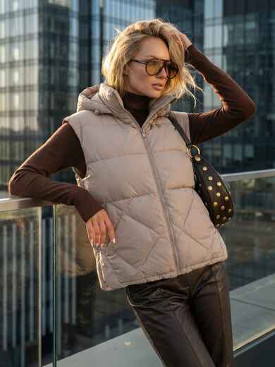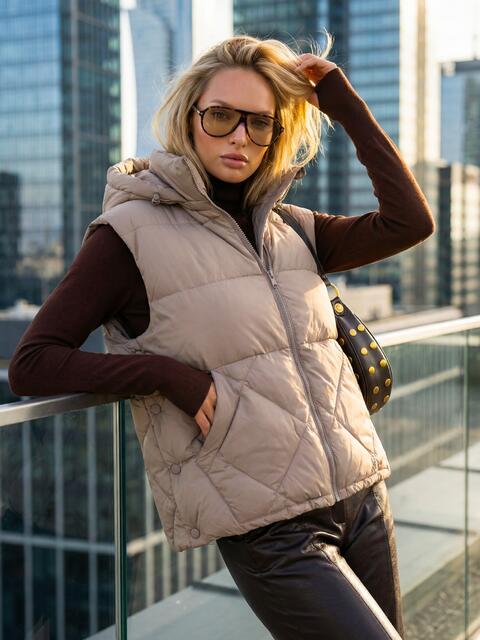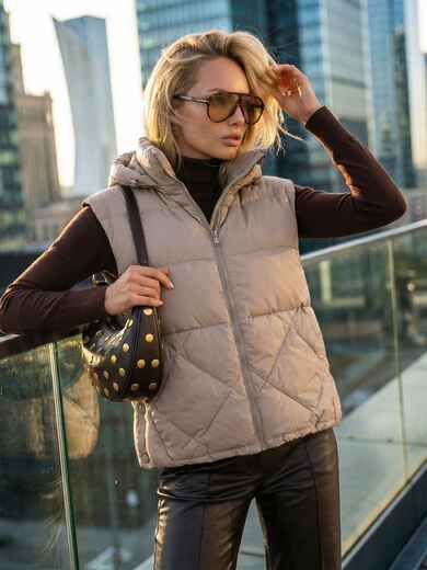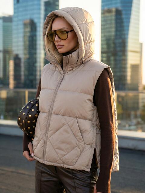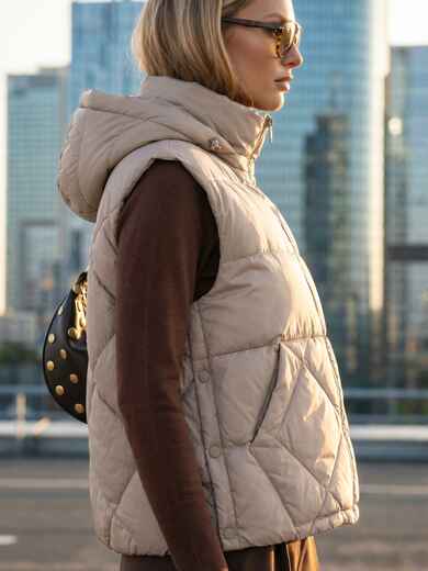 Стьобаний демісезонний жилет. Високий комір-стійка переходить у знімний капюшон з куліскою та фіксаторами для захисту від вітру. Доповнений прорізними кишенями. Застібається на блискавку. Наповнювач - біопух. Підходить на температурний режим до -3°C.